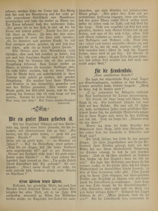 nehmen, welchen Lohn die Treue hat. Der König hieß ihn nach der Bewahrung aus der nicht ge⸗ rade angenehmen Gesellschaft von Raubtieren herausziehen und setzte ihn wieder zu Ehren ein. Die Treue bekommt doch den verdienten Lohn. „Sei getreu bis in den Tod, so will ich dir die Krone des Lebens geben!“ Daniel kam hier zeit— lich schon zu Ehren. Zu dem, der hier unten treu gewesen ist wird der Herr einst sprechen: „Ei, du frommer und getreuer Knecht, du bist über wenigem getreu gewesen, ich will dich über viel setzen, gehe ein zu deines Herrn Freude.“