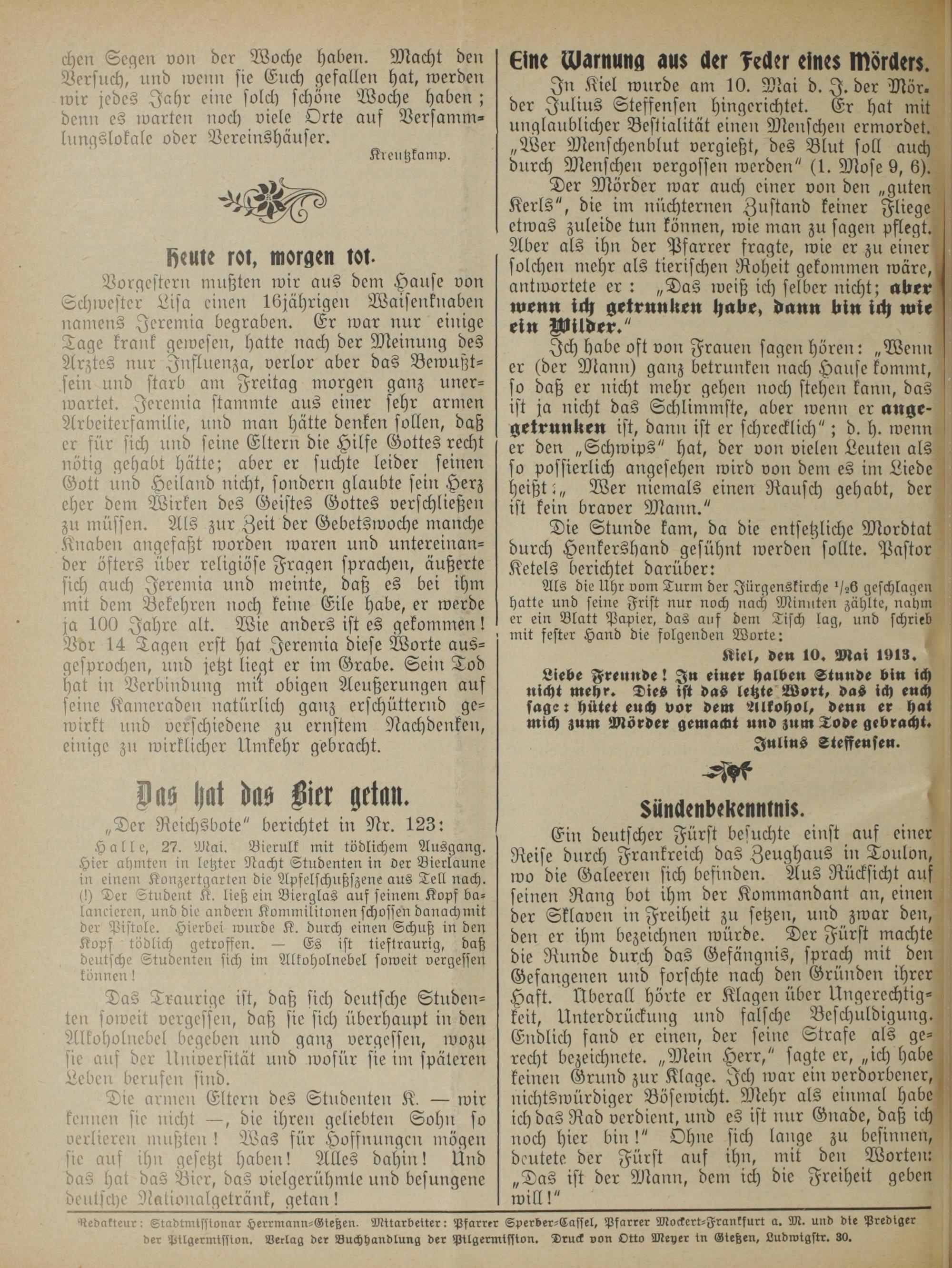 sedatteur: Stadtmisstonar Herrmann-Gießen. Mitarbeiter: Pfarrer Sperber-Cassel, Pfarrer Mockert-Frankfurt a. M. und die Predi der Pilgermisston. Verlag der Buchhandlung der Pilgermisston. Druck von Otto Meyer in Gießen, Ludwigstr. 30.