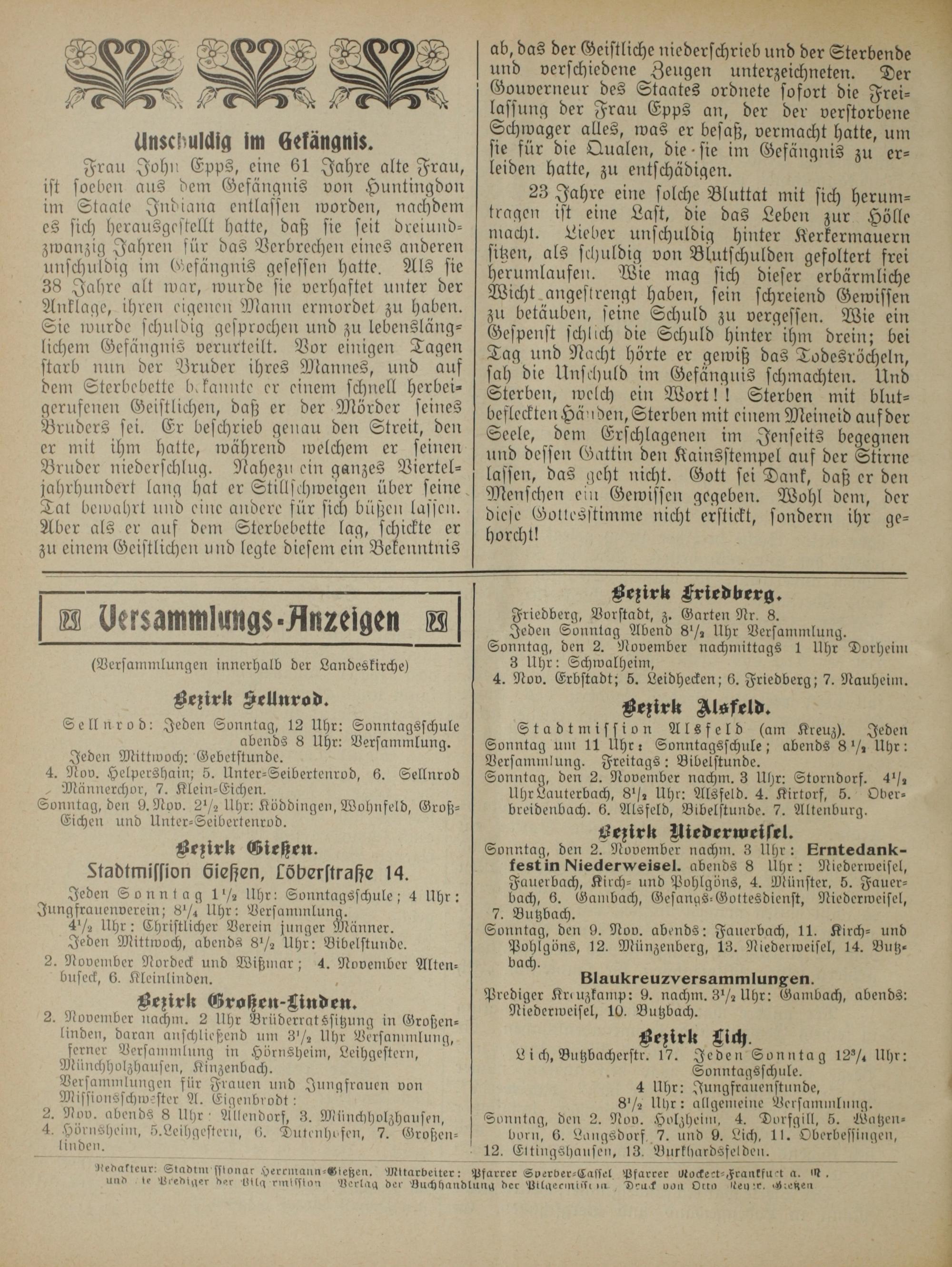 Bezirk Alsfeld. Stadtmission Alsfeld(am Kreuz). Jeden Sonntag um 11 Uhr: Sonntagsschule; abends 8 ½ Uhr: Versammlung. Freitags: Bibelstunde. Sonntag, den 2. November nachm. 8 Uhr: Storndorf. 4½ Mb aut 8½ Uhr: Alsfeld. 4. Kirtorf, 5. Ober- breidenbach. 6. Alsfeld, Bibelstunde. 7. Altenburg.