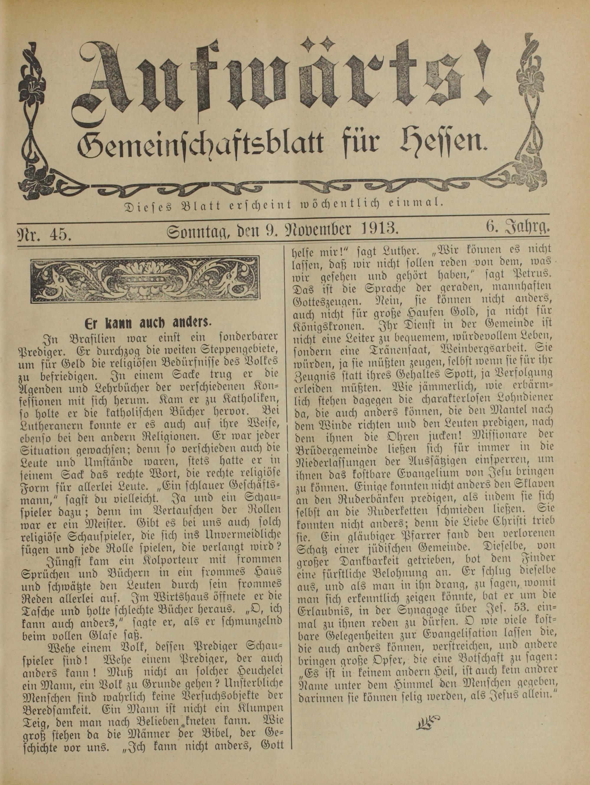 nicht eine Leiter zu bequemem, würdevollem Leben, sondern eine Tränensaat, Weinbergsarbeit. Sie würden, ja sie müßten zeugen, selbst wenn sie für ihr Zeugnis statt ihres Gehaltes Spott, ja Verfolgung erleiden müßten. Wie jämmerlich, wie erbärm⸗ lich stehen dagegen die charakterlosen Lohndiener da, die auch anders können, die den Mantel nach dem Winde richten und den Leuten predigen, nach dem ihnen die Ohren jucken! Missionare der Brüdergemeinde ließen sich für immer in die Niederlassungen der Aussätzigen einsperren, um ihnen das kostbare Evangelium von Jesu bringen zu können. Einige konnten nicht anders den Sklaven an den Ruderbänken predigen, als indem sie sich selbst an die Ruderketten schmieden ließen. Sie konnten nicht anders; denn die Liebe Christi trieb sie. Ein gläubiger Pfarrer fand den verlorenen Schatz einer jüdischen Gemeinde. Dieselbe, von großer Dankbarkeit getrieben, bot dem Finder eine fürstliche Belohnung an. Er schlug dieselbe aus, und als man in ihn drang, zu sagen, womit man sich erkenntlich zeigen könnte, bat er um die Erlaubnis, in der Synagoge über Jes. 53. ein⸗ mal zu ihnen reden zu dürfen. O wie viele kost⸗ bare Gelegenheiten zur Evangelisation lassen die, die auch anders können, verstreichen, und andere bringen große Opfer, die eine Botschaft zu sagen: „Es ist in keinem andern Heil, ist auch kein andrer Name unter dem Himmel den Menschen gegeben, darinnen sie können selig werden, als Jesus allein.“