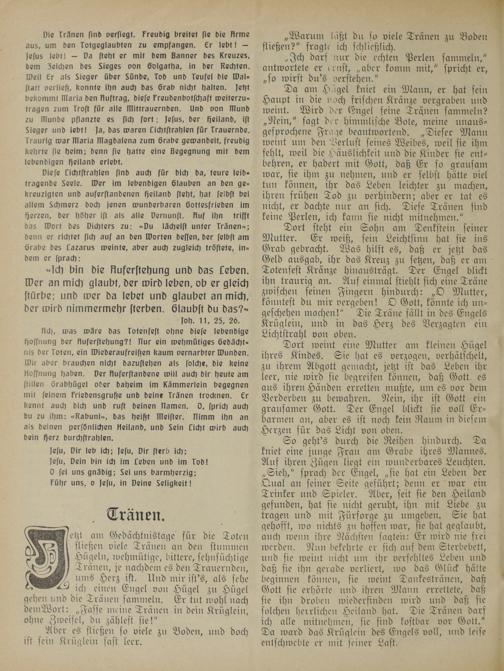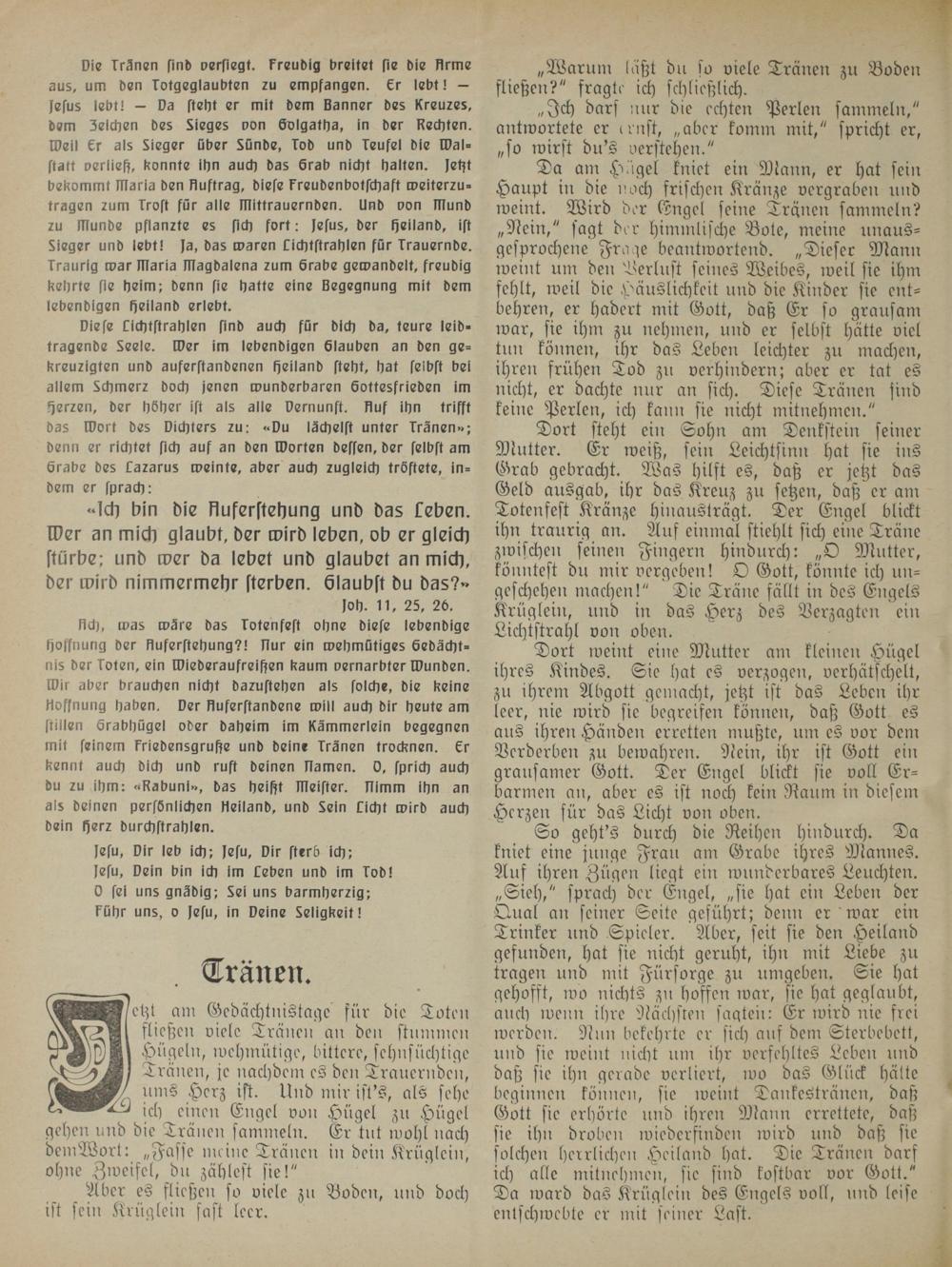 etzt am Gedächtnistage für die Toten fließen viele Tränen an den stummen Hügeln, wehmütige, bittere, sehnsüchtige Tränen, je nachdem es den Trauernden, ums Herz ist. Und mir ist's, als sehe ich einen Engel von Hügel zu Hügel Er tut wohl nach