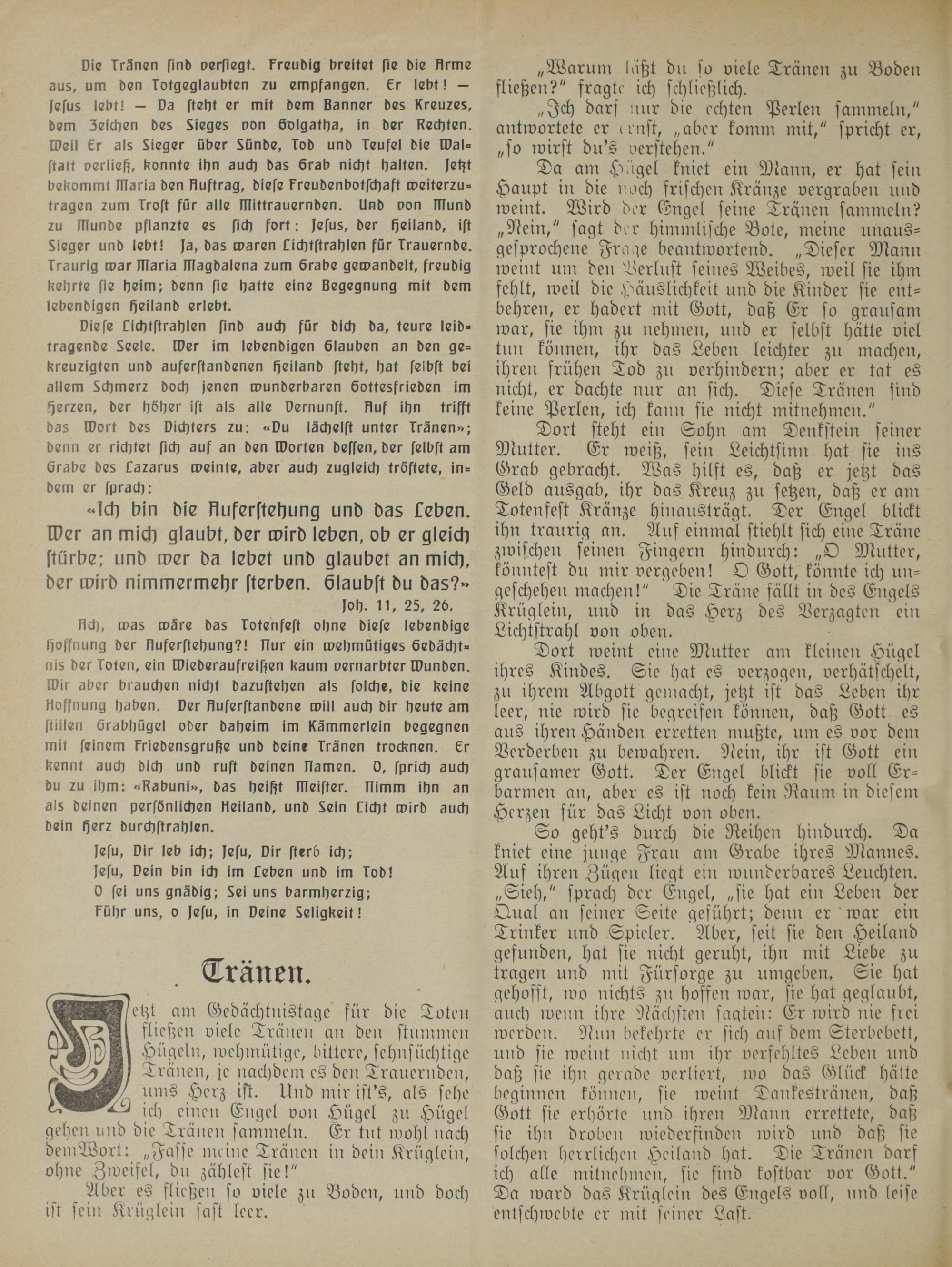 So geht's durch die Reihen hindurch. Da kniet eine junge Frau am Grabe ihres Mannes. Auf ihren Zügen liegt ein wunderbares Leuchten. „Sieh,“ sprach der Engel,„sie hat ein Leben der Qual an seiner Seite geführt; denn er war ein Trinker und Spieler. Aber, seit sie den Heiland gefunden, hat sie nicht geruht, ihn mit Liebe zu tragen und mit Fürsorge zu umgeben. Sie hat gehofft, wo nichts zu hoffen war, sie hat geglaubt, auch wenn ihre Nächsten sagten: Er wird nie frei werden. Nun bekehrte er sich auf dem Sterbebett, und sie weint nicht um ihr verfehltes Leben und daß sie ihn gerade verliert, wo das Glück hätte beginnen können, sie weint Dankestränen, daß Gott sie erhörte und ihren Mann errettete, daß sie ihn droben wiederfinden wird und daß sie solchen herrlichen Heiland hat. Die Tränen darf ich alle mitnehmen, sie sind kostbar vor Gott.“ Da ward das Krüglein des Engels voll, und leise entschwebte er mit seiner Last.