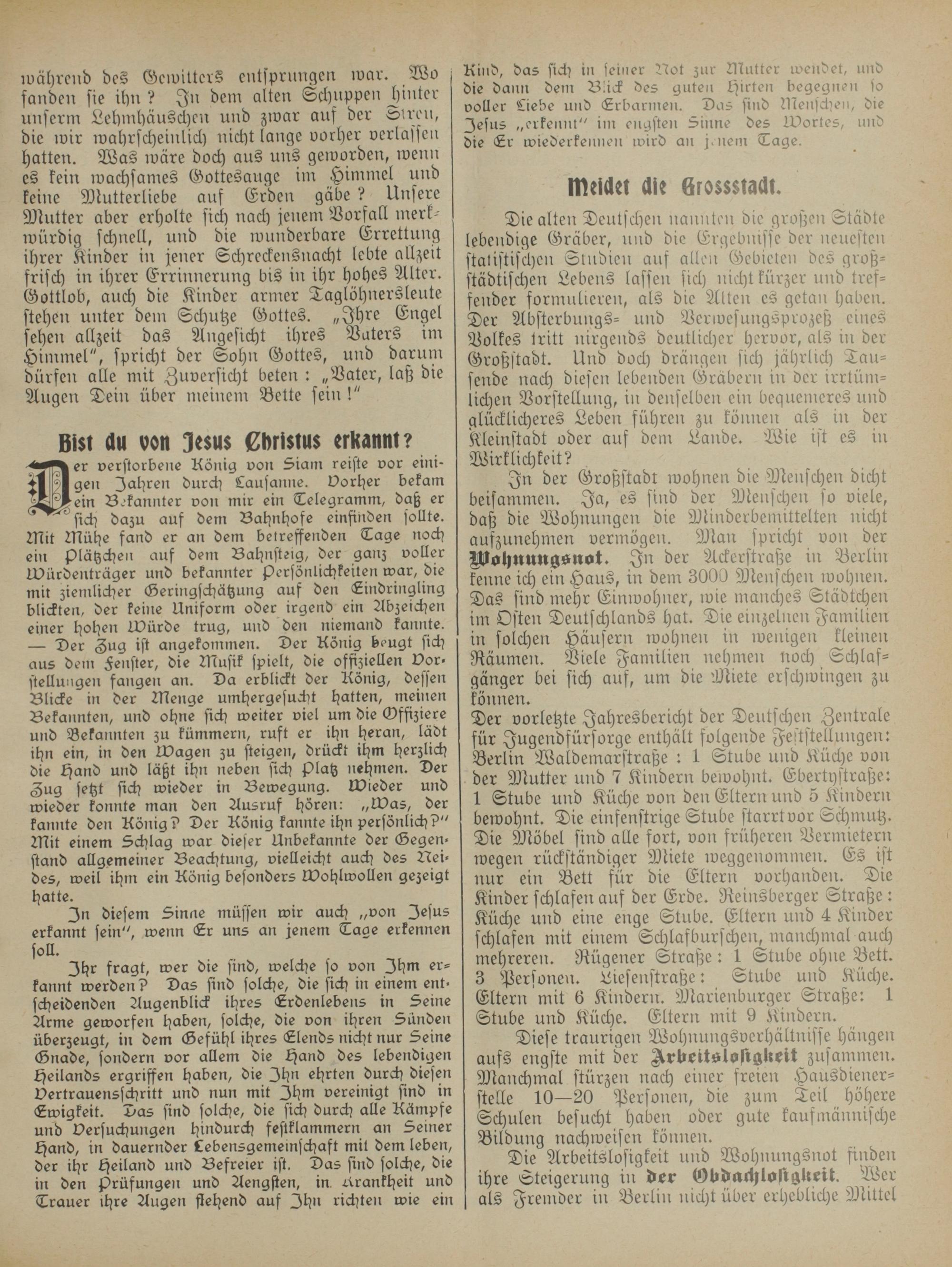 Wo fanden sie ihn? In dem alten Schuppen hinter unserm Lehmhäuschen und zwar auf der Streu, die wir wahrscheinlich nicht lange vorher verlassen hatten. Was wäre doch aus uns geworden, wenn es kein wachsames Gottesauge im Himmel und keine Mutterliebe auf Erden gäbe? Unsere Mutter aber erholte sich nach jenem Vorfall merk— würdig schnell, und die wunderbare Errettung ihrer Kinder in jener Schreckensnacht lebte allzeit frisch in ihrer Errinnerung bis in ihr hohes Alter. Gottlob, auch die Kinder armer Taglöhnersleute stehen unter dem Schutze Gottes.„Ihre Engel sehen allzeit das Angesicht ihres Vaters im Himmel“, spricht der Sohn Gottes, und darum dürfen alle mit Zuversicht beten:„Vater, laß die Augen Dein über meinem Bette sein!“