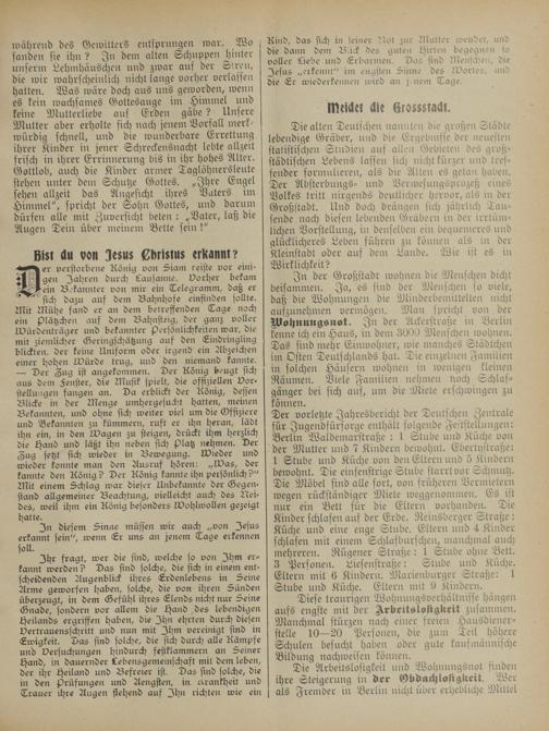 In der Großstadt wohnen die Menschen dicht beisammen. Ja, es sind der Menschen so viele, daß die Wohnungen die Minderbemittelten nicht aufzunehmen vermögen. Man spricht von der Wohnungsnot. In der Ackerstraße in Berlin kenne ich ein Haus, in dem 3000 Menschen wohnen. Das sind mehr Einwohner, wie manches Städtchen im Osten Deutschlands hat. Die einzelnen Familien in solchen Häusern wohnen in wenigen kleinen Räumen. Viele Familien nehmen noch Schlaf— gänger bei sich auf, um die Miete erschwingen zu können.