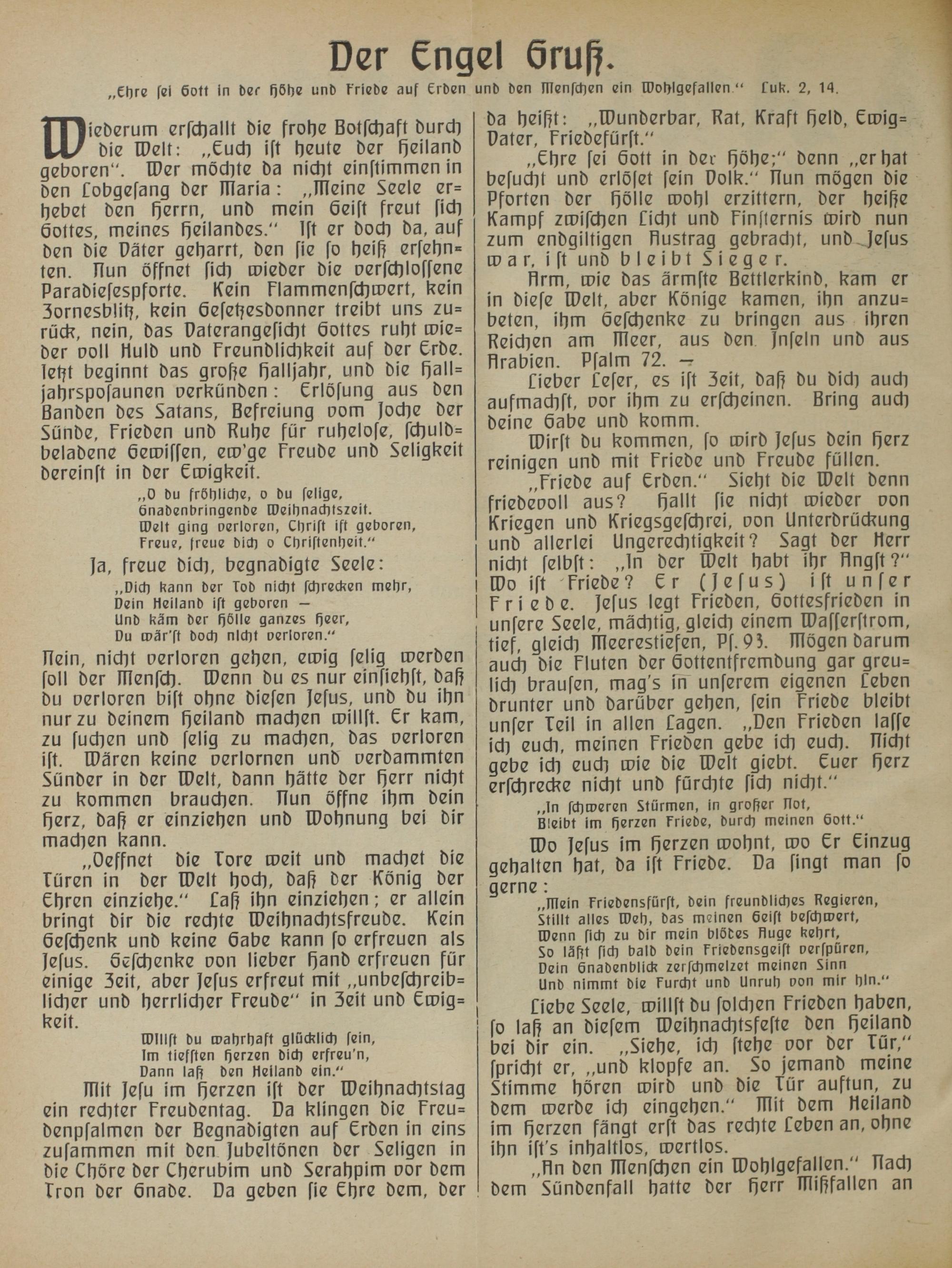 „Friede auf Erden.“ Sieht die Welt denn friedeboll aus? hallt sie nicht wieder von Kriegen und Kriegsgeschrei, von Unterdrückung und allerlei Ungerechtigkeit? Sagt der Herr nicht selbst:„In der Welt habt ihr Hngst?“ o ist kriede? Er(Jesus) ist unser Friede. jesus legt Frieden, Gottesfrieden in unsere Seele, mächtig, gleich einem Wasserstrom, tief, gleich Ileerestiefen, Pf. 93. Illögen darum auch die Fluten der Gottentfremdung gar greu— lich brausen, mag's in unserem eigenen Leben drunter und darüber gehen, sein Friede bleibt unser Teil in allen lagen.„Den Frieden lasse ich euch, meinen Frieden gebe ich euch. licht gebe ich euch wie die elt giebt. Euer herz erschrecke nicht und fürchte sich nicht.“