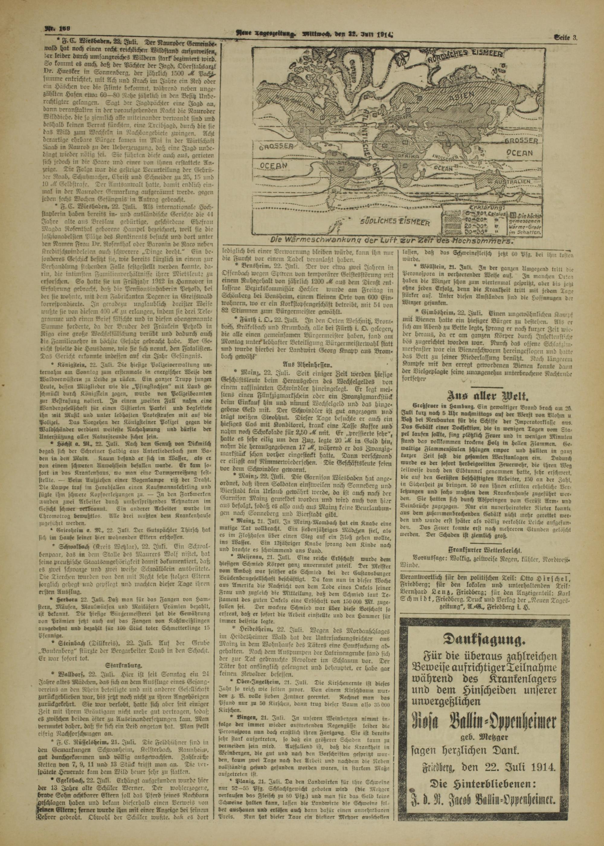 Verantwortlich für den politischen Teil: Otto Hirsche!, Friedberg; für den lokalen und unterhaltenden Teil- Bernhard Lenz, Friedberg; für den Anzeigenteil: Karl Schmidt, Friedberg. Druck und Vertag der „Neuen Tages- zeitung", A.-G., Friedberg i. H.
