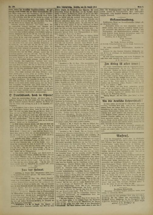 Durch den Kriegszustand werden schon in allerkürzester Frist große Notstände für viele auch in unserer Stadt cintreten. Viele Ernährer ihrer Familien solgc» de» Fahnen, viele der Zurückblcibcnden werden Mangel leiden nn Nahrung und Kleidung, Kranke und Verwundete werden der Pflege bedürfen. Staat, Gemeinden, Armenoercine werde» helfend ein- greisen. Aber sie tonnen nicht alles tun. Daneben ist cs unerläßlich, daß private Hilfe raschestens eintritt. Nun gilt es, daß jedes, soweit es kann, das Seine zu tun.