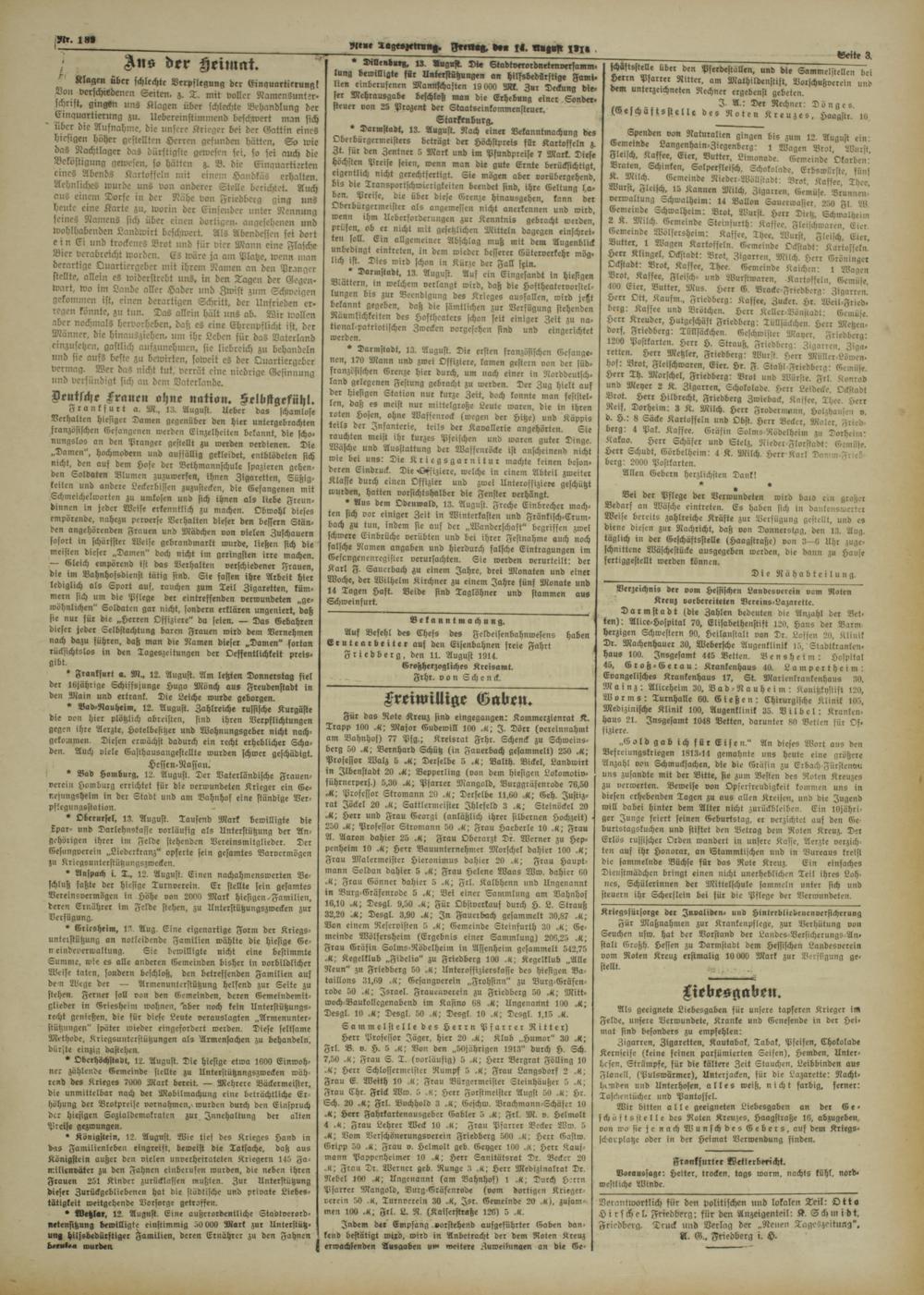Für das Rote Kreuz sind eingegangen: Kommerzienrat K. Trapp 186 M; Major Eudewill 108 M; I. Dörr (vereinnahmt am Bahnhof) 77 Psg.; Kreisrat Frhr. Schenck zu Schweinsberg 56 Bernhard Schütz (in Fauerbach gesammelt) 258 Jl] Professor Walz 5 Ji] Derselbe 5 Balth. Bickel, Landwirt in Ilbenstadt 28 M; Bepperling (von dem hiesigen Lokomotio- sührnerpers.) 5,38 Ji] Psarrer Mangold, Burggräsenrode 76,58 Ji] Professor Stromann 20 Derselbe 11,60 Jl; Geh. Justizrat Jöckel 28 Jl; Sattlermeister Jhlefeld 3 Steinöckel 20 Jl; Herr und Frau Eeorgi (anläßlich ihrer silbernen Hochzeit) 258 Ji; Professor Stromann 50 Jl] Frau Haeberle 10 .8; Frau 31. Aaron dahier 25 Ji] Frau Oberarzt Dr. Werner zu Heppenheim 18 Ji] Herr Bauunternehmer Mörschel dahier 188 Jl] Frau Malermeister Hieronimus dahier 28 Frau Hauptmann Soldan dahier 5 Ji] Frau Helene Waas Ww. dahier 68 Frau Gönner dahier 5 Ji; Frl. Kalbhenn und Ungenannt in Burg-Gräfenrode 5 Jl; Bei einer Sammlung am Bahnhos 16,18 Desgl. 9,58 Ji; Für Obstoerkaus durch H. L. Strauß 32,28 M; Desgl. 3,90 Ji] In Fauerbach gesammelt 38,87 Von einem Reservisten 5 M ; Gemeinde Steinfurth 30 Jl] Gemeinde Wölfersheim (Ergebnis einer Sammlung) 286,25 Ji] Frau Gräfin Solms-Rödelheim i» Affenheim gesammelt 542,75 Jl; Kegelklub „Fidelio" zu Friedberg 180 Kegelklub „Alle Neun" zu Friedberg 58 Ji] Unteroffizierslasse des hiesigen Bataillons 31,69 Gesangverein „Frohsinn" zu Burg-Gräfcn- rode 58 Israel. Fraueuverein zu Friedberg 58 Ji] Mitt- woch-Baukollegenabend im Kasino 68 Ji] Ungenannt 100 Ji] Desgl. 10 Desgl. 50 Desgl. 10 Desgl. 1,15 Sammelstell« des Herrn Psarrer Ritter)