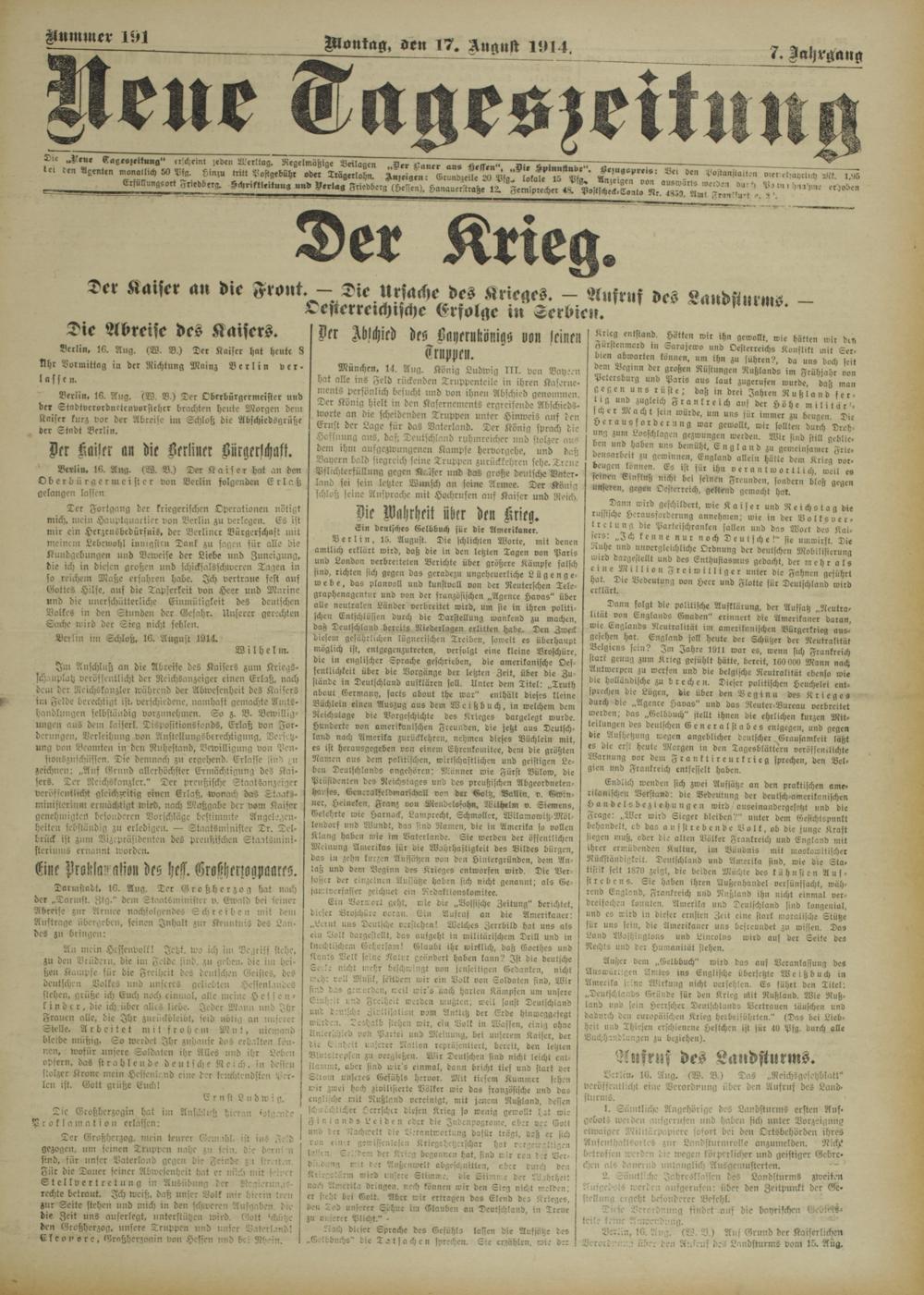 Der Kaiser an die Front. — Die Ursache des Krieges. — Aufruf des Landsturms. —