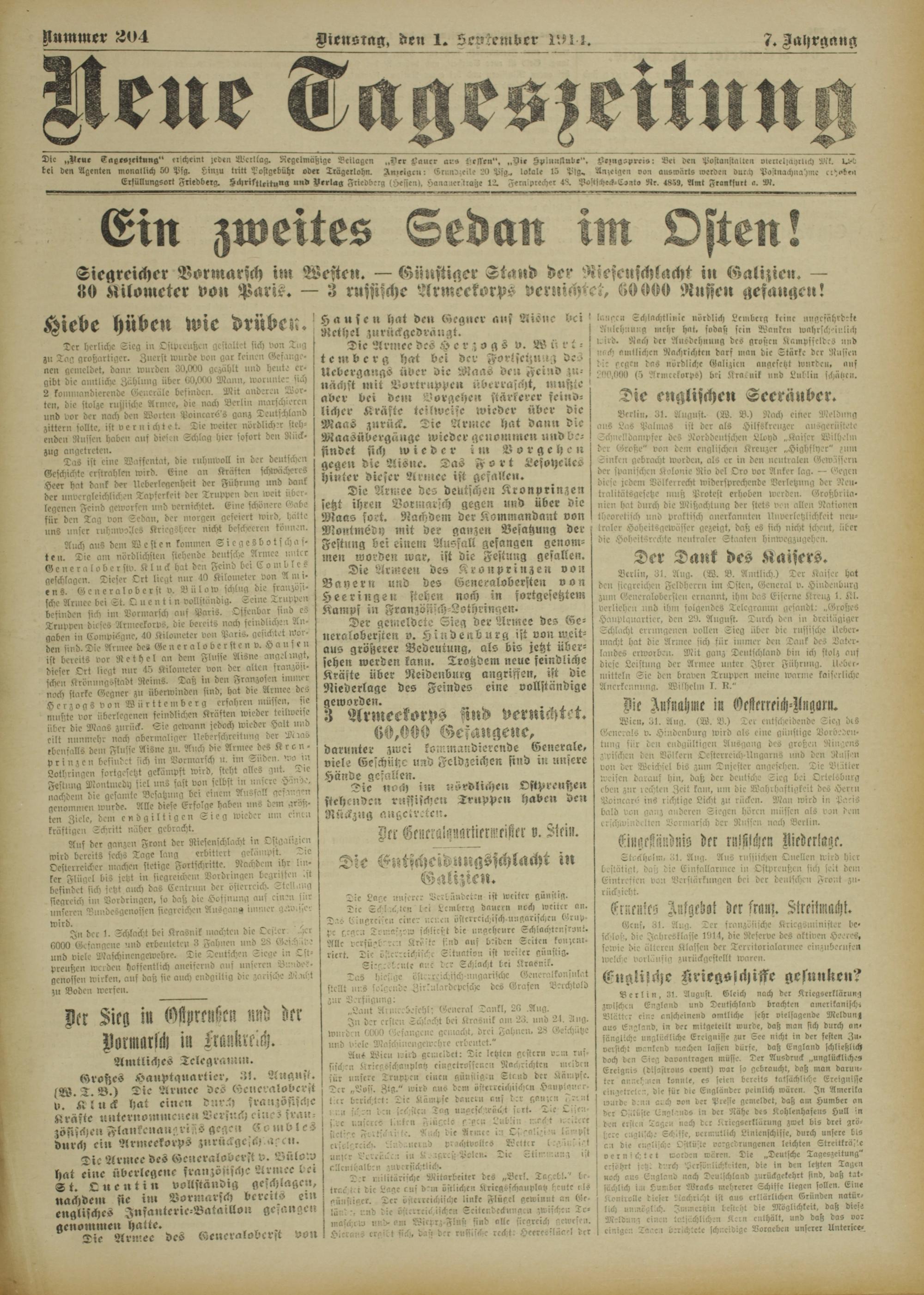 Der gemeldete Sieg der Armee des Generalobersten v. Hindenburg ist von weitaus gröberer Bedeutung, als bis jetzt übersehen werden kann. Trotzdem neue feindliche Kräfte über Neidenburg angrisfen, ist die Niederlage des Feindes eine vollständige geworden.
