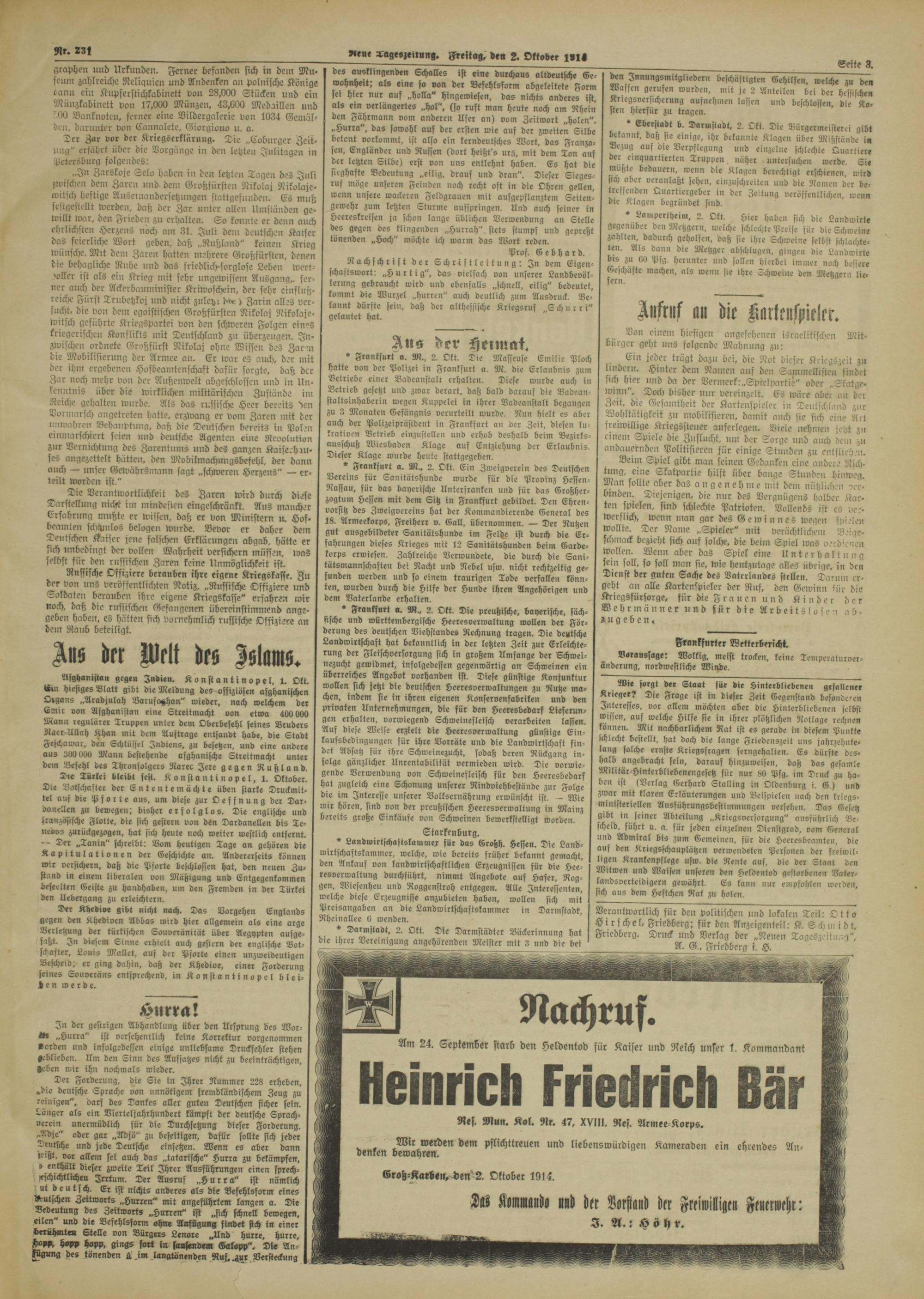Verantwortlich für den politischen und lokalen Teil: Otto Hirsches, Friedberg: für den Anzeigenteil: K. Sch m i d t. Friedberg. Druck und Verlag der „Neuen Tageszeitung", A. G., Friedberg i. H.