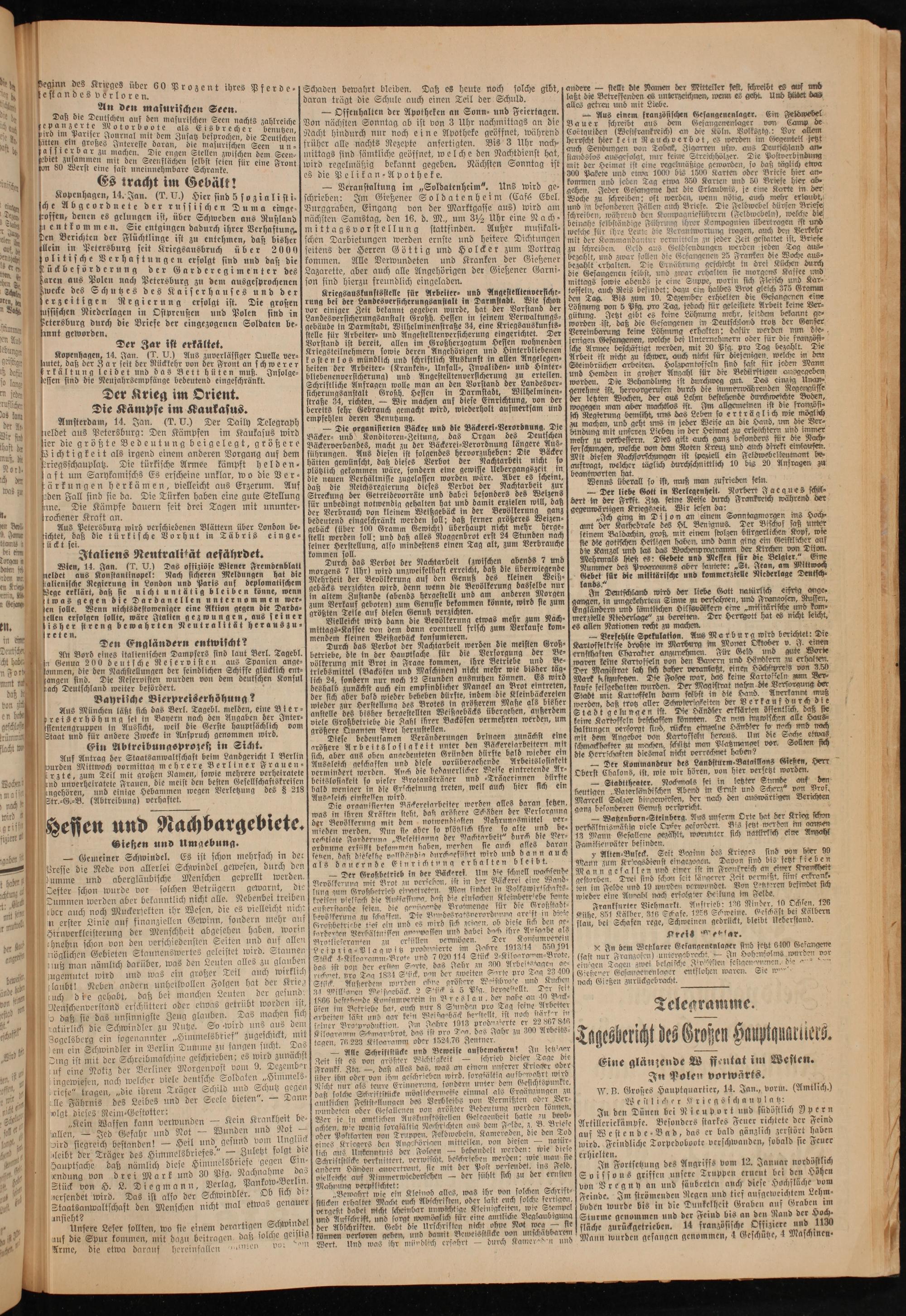 Eine glänzende W'e ffentat im Wesien. In Polen vorwärts. W. B. Großes Hauptquartier, 14. Jan., vorm.(Amtlich.) Westlicher Kriegsschauplatz: