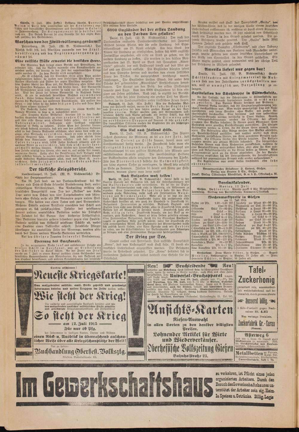 Wochenmarktpreise in Gießen am 11. Juli 1915