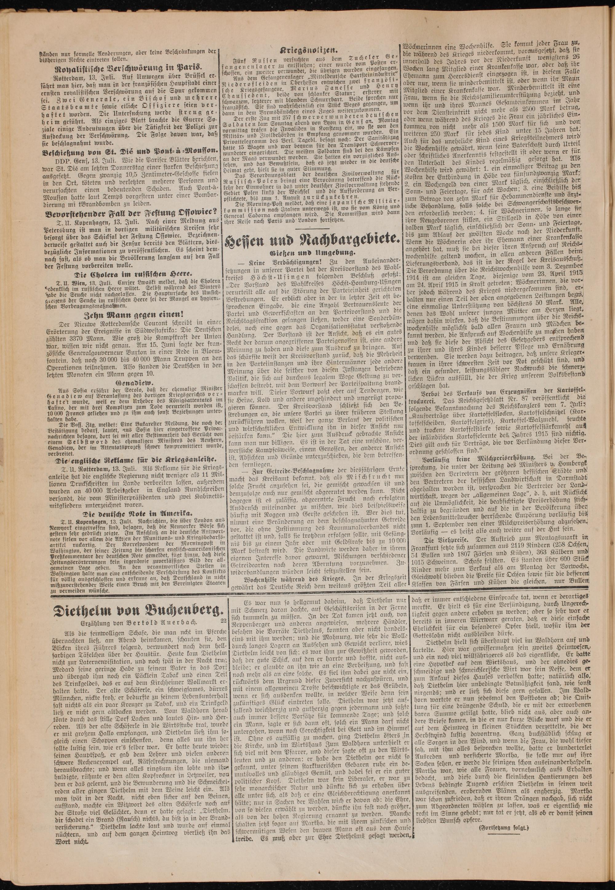 Rotterdam, 13. Juli. Auf Umwegen über Brüssel er⸗ fährt man hier, daß man in der französischen Hauptstadt einer ernsten royalistischen Verschwörung auf die Spur gekommen sei. Zwei Generale, ein Bischof und mehrere Staatsbeamte sowie etliche Offiziere seien ver⸗ haftet worden. Die Untersuchung werde streng ge⸗ heim geführt. Als einziges Blatt brachte die Guerre So⸗ ziale einige Andeutungen über die Tätigkeit der Polizei zur Aufdeckung der Verschwörung. Die Folge davon war, daß sie beschlagnahmt wurde. Beschießung von St. Dié und Pont⸗ à⸗Mousson.