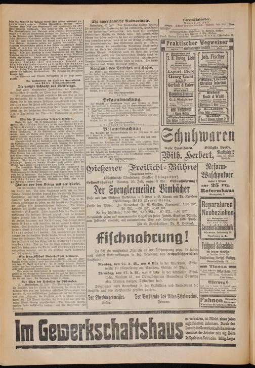 2. Der Zweiganstalt der Tiefbauberufsgenossenschaft. 6 5 f Gemischtes 3. Der Versicherungsgenosfenschaft der Privatfahrzeug⸗ und 10. Haien Welzlak. 1. Jean Fabel e tierbesitzer. feischereien 6 12 Gießen, den 19. Juli 1915. g 5 0 . 5 Der Oberbürgermeister: ll. Leber e Test. L. Schlier, Label. 2. germeis 5. J. A.: Schenck zu Schweinsberg. 1. Bekanntmachung 1 f a Die Ausgabe der Brotmarlenhefte für die Zeit vom 26. Juli 2