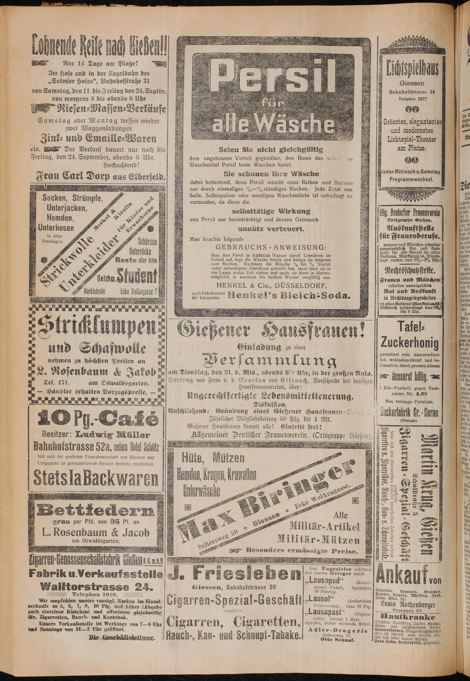am Dienstag, den 21. d. Mits., abends 3½ Uhr, in der großen Aula. Vortrag von Frau v. d.. aus Eisenach, Vorsitzende des dortigen Hausfrauenvereins, über: Ungerechtfertigte Lebensmitteltenerung. Diskussion. Anischließend: Gründung eines Gießener Hausfrauen Jährlicher Mitgliedsbeitrag 50 Pfg. bis 1 Mk. Gießener Hausfrauen kommt alle! Eintritt frei!