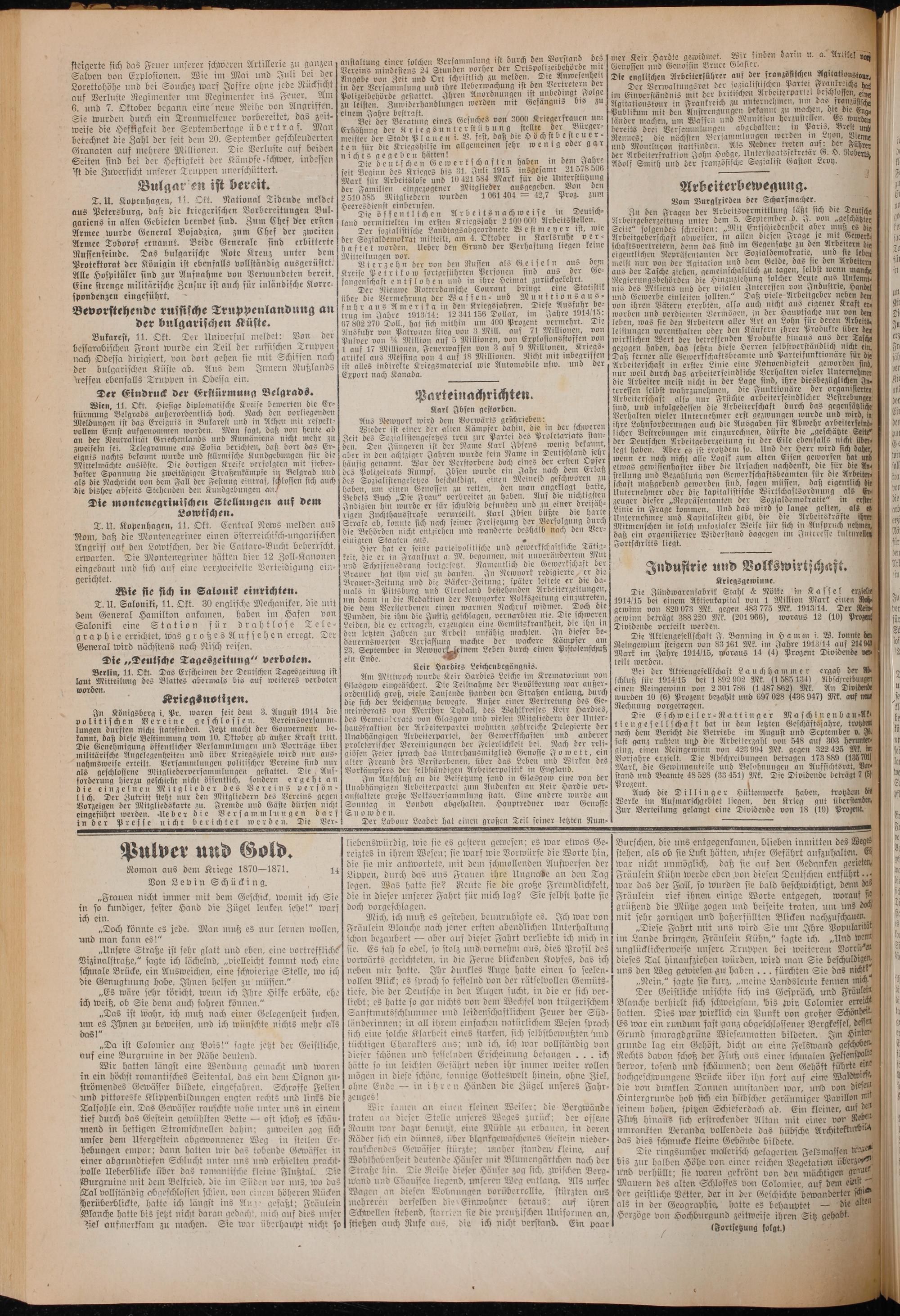 Bei der Beratung eines Gesuches von 3000 Kriegerfrauen um Erhöhung der Kriegsunter st ü tzung stellte der Bürger⸗ meister der Stadt Plauen i. V. fest, daß die Höchstbe steuer⸗ ten für die Kriegshilfe im allgemeinen sehr wenig oder gar nichts gegeben hätten! 5 Die deutschen Gewerkschaften haben in dem Jahre seit Beginn des Krieges bis 31. Juli 1915 insgesamt 21578 506 Mark für Arbeitslofe und 10 421 584 Mark für die Unterstützung der Familien eingezogener Mitglieder ausgegeben. Von den