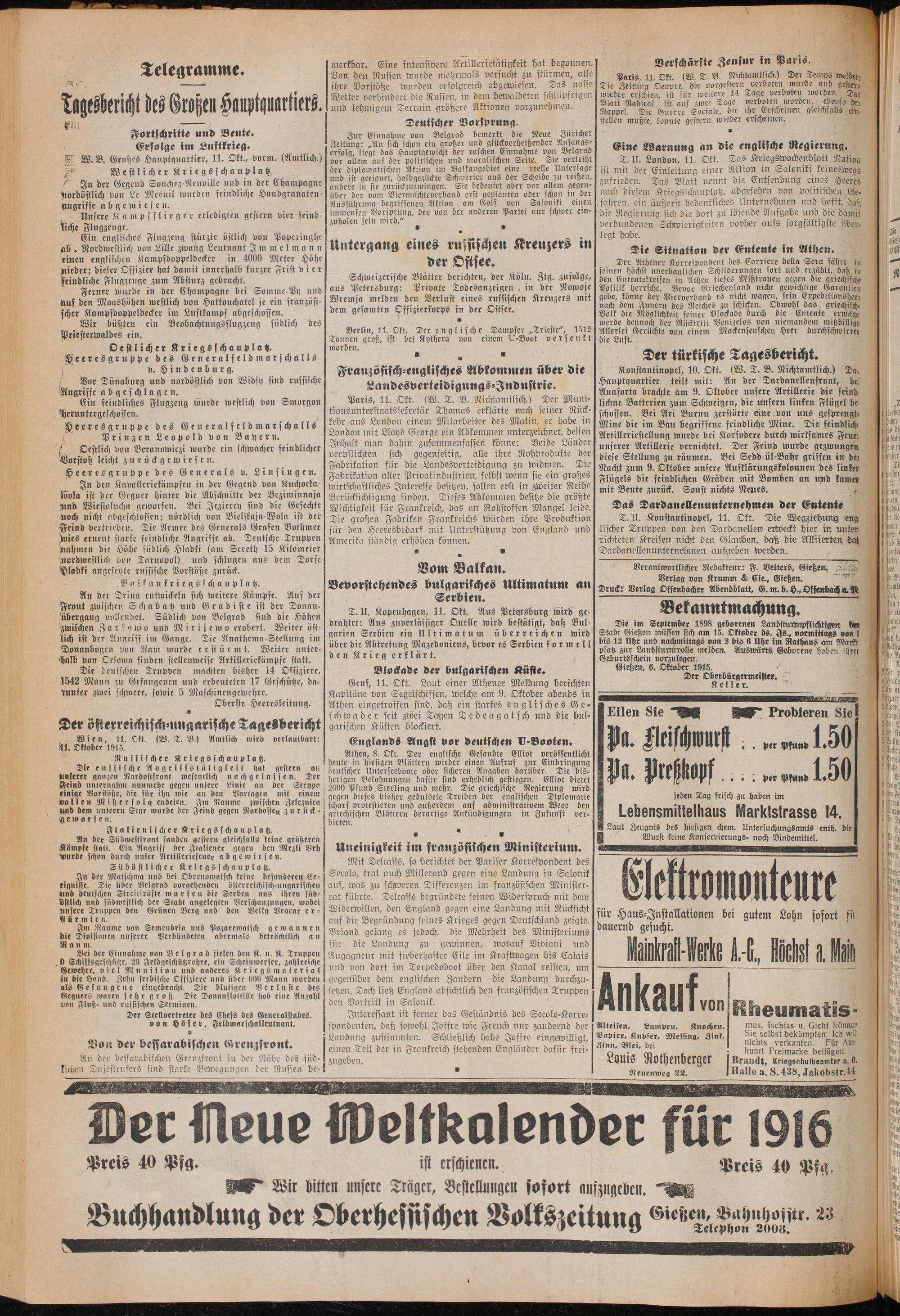 Fortschritte us und Beute. N Erfolge im Luftkrieg. W. B. Großes Hauptquartier, 11. Okt., vorm.(Amtlich.) K Westlicher Kriegsschauplatz In der Gegend Souchez-Neuville und in der Champagne Kordöstlich von Le Mesnil wurden feindliche Handgranaten⸗ ungriffe abgewiesen. a Unsere Kampfflieger erledigten gestern vier feind— liche Flugzeuge.