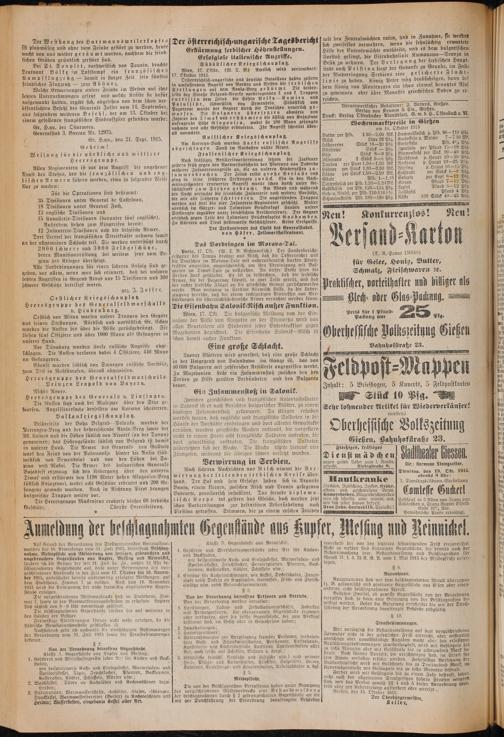 Auf Grund der Verordnung des Stellvertretenden Generalkom⸗ mandos des 18. Armeekorps vom 34. Juli 1915, betreffend Beschlag⸗ nahme, Meldepflicht und Ablieferung von fertigen, gebrauchten und ungebrauchten Gegenständen aus Kupfer, Messing und Reinnickel, fordere ich die Besitzer der seit 31. Juli ds. IJs., nachts 12 Uhr be⸗ schlagnahmten Gegenstände auf, diese unter Verwendung des vor⸗ geschriebenen Vordrucks in der Zeit vom 17. Oktober bis 16. Novem⸗