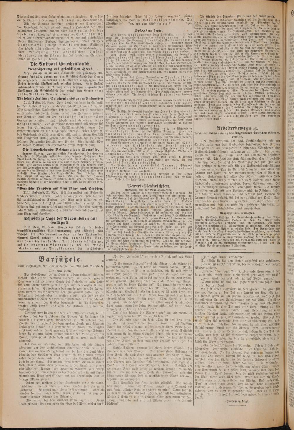Vierverbandstruppen Schwierigkeiten zu bereiten. Eine der⸗. J 9 0 N. gcc artige Garantie gebe nur die Abrüstung Griechenlands. Ratschlages, die Halbinsel Gallipoli zu räumen. Die Der kommende Schweizer Parteitag soll die Entscheidun 10 Wie die Stampa berichtet, verlangt der Vierverband Minister b en, erst von Kitchener ein C zu- die Stellung der Gritlivereine innerhalb der Schweizer f 5 8 5 e 1 fällen. Die Auseinandersetzung liegt seit Jahren in der von Griechenland, daß es nicht nur die Sicherheit der schon] warten. 5 brennend wurde sie jetzt durch die Kriegswirren, die neue L gelandeten Truppen, sondern aller noch zu landender Kriegsnssizen. ider Internationale und die Notwendigkeit, zur Konferenz von verbürge, sowie daß es nie zu einer Entwaffnung, Die Partei Nordbayerus hatte beschlossen, unn Protest Zimmerwald Stellung zu nehmen. Der Grütliverein, der ale fü sei es der Vierverbandstruppen, sei es der auf griechischen sgegen die herrschende Lebensmittelteuerung in den ältere Organisation seine Selbständigkeit nicht aufgeben will, bildet 0 5 2 4 5 ies„größeren Orten Nordbayerns öffentliche Volksversamm⸗ zwar zahlenmäßig eine Minderheit in der Partei, doch ist er an d Ad Boden flüchtenden Serben, schreiten werde. Dies soll Herr lungen über die Lebensmittelfrage abzuhalten. Während diesen] Wahl des 11köpfigen Parteivorstandes mit 5 Vertretern beteiligt, Nele Denys Cochin zunächst in Güte erreichen. Sollte es Lersammlungen im Bezirk des 3. bayerischen Armeekorps keine] besitzt eine gutgeleitete Presse und verfügt über einen starken Ein⸗ lite ihm jedoch nicht gelingen, so werde man wahrscheinlich zu Schwierigkeiten von den Behörden in den Weg gelegt werden, sind fluß. Es spielen natürlich in der Polemik der beiden Richtungen 2105 einer Besetzung der griechischen Inselnssie im Bezirk des 2. bayerischen Armeekorps verboten worden. starke personliche Momente mit: durch den dauernden Vorwurf an f 1 11 85 1. ö Der„Bund“ weiß einen ebenso erstaunlichen wie kennzeich⸗ die Adresse des Grütlivereins, daß er alle Aemter und Ehren für i schreiten ein pan d für dos Werden ene 9 rg französischen Aeufur zu melden.] sich in Anspruch nehme, klingt in vielen Fällen der Neid auf ebe ut! lands in Händen zu haben.— Es bat sich nämlich herausgestellt, daß diese samtliche Einladungen] diese Aemter hindurch. Es sind gerade die Kreise, die die Zimmer 90 5 j 3 be i ee, Or. walder Konferenz einberiefen, die— wie der Avanti es seinet 0 Die Antwort Griechenlands. r Zeit nannte— die schwefzerische wege keine, daß le 1 8 aa 35 0 Persönlichkei 15 a je Taft Rooser f seschickt. lösen“ wollen, während sie immer wieder betonen, daß sie auf bie c 0%% Pesti Hirlap meldet aus Saloniki: Die griechische Re⸗ W Briefe l. ffest entschlossen, an ihrer alten Selbstverantwortlichkeit fest 5 gierung setzt alles daran, um den Effektivbestand des Heeres Der Adsutant des Zaren, Generalmajor Djiunkowski ließ halten und sich nicht ins Bockshorn jagen zu lassen durch die„thebs e ö Es werden auch Männer ei die nach einer Automobilfahrt seine Lede die ichtiges retischen Schmeißfliegen, wie, ihr Organ, Der Grüttianer et zu vergrößern. erden U 0 eingezogen, ie s nach einer Auton fahrt seine Ledermappe, die sehr w cht ig Gegner 6 Blatt fordert im Hinblick auf die kommend Anm bisher keinerlei Waffendienst geleistet haben. Nach Ansich! Schriftstücke enthielt, im Wagen liegen. Die Mappe ist seite] A Aut de Das 2 75 17 f. eher die Parteieinheit z 10 514255 77 ö; 4: dem verschwunden, was in der Umgebung des Zaren und im] Auseinandersetzungen die Genossen auf, eher die ieinhei rech. militärischer Kreise wird nach einer letzthin angeordneten Kriegsministerium große Aufregung verursachte. Die Polizei] opfern, als die Richtungsänderung, die verlangt wird, vorzunehme eine Verfügung die Effektivstärke des griechischen Heeres eine fahndet eifrig nach der Autodroschke. Die Nachforschungen waren oder sich mundtot machen zu lassen. Denn eine leere Form der Or⸗ ei a halbe Million Mann betragen. bisher ergebnislos. Djunkowski ist seiner Stellung enthoben steher: de der ng 1 Welten Were 110 Die loyale Haltung Griechenlands gegen Bulgarien 1 Bezirkskriegsgericht Jekaterinoslaw verurteilte den öster⸗ haben, die alles mit Wage, Meter, Zahl bestimmt und mißt und lhnen T. U. Sofia, 20. Nov. Vom Landungskorps in Saloniki reichischen Kriegsgefangenen Schumejer zum Tode, amchen merbalb ber 11 bei stattun wurden bisher Truppen nach Serbisch-Mazedonien dirigiert. angeblich weil er einen Fabrikswächter unter einen Eisenbahnzug Anzeige Ausbildung des Intelekts die seelischen Kräfte lite Wie zuverlässige Nachrichten besagen, hatte der Vierverband gestoßen hat.. 5 5 e ze darben und verdorren lasfen.„Es fragen Nationen und Klassen lee 5 5 8 85. 5 Die Rußkija Wjedomosti berichtet aus Odessa über eine nie dan 7 55 i ir Soziald 0 an Griechenland die Forderung gestellt, die Zusammenziehungsdagewesene Not unter den Studenten, deren Zahl durch nür nocht was nützt's, was trägt s ein?„„ wir Sozialdemokraten auen von Truppen auch an der griechisch-bulgarischens Flüchtlinge gestiegen sei. Vielfach kämen buchstäblich Sangerfale fapttafiseiscen 5 auch nicht ein Jota von der verpönten iinlan Grenze zu gestatten, was jedoch entschieden ver- ver. Der Rektor hat öffentliche Hilfsmaßnahmen eingeleitet. Eine kapftaßestlschen Welt. 1 ier weigert wurde. Der griechische Generalstab widersetzte sich Anzahl Studenten der früheren Warschauer Universität in Rostow 1 0 N d Ent 5 d 91 3 Sabteil der am Don arbeiten als Hafenarbeiter. 8 f J cer be. f 8 sen 110 e 5 1 5 0. 1 55 gra 99 en en russischer Blätter ist es in Aschabad in Arbeiterbewegung. un d: ntentetruppen an die bulgarische Grenze. des bestätigt,[ Transkaspien hinter der kaukasischen Front zu schweren 9a 713 5 5 24 ift daß Griechenland alles vermeiden will, was zu einem Konflikt[ Ausschreitungen und Unruhen gekommen. Auf einer Weihn