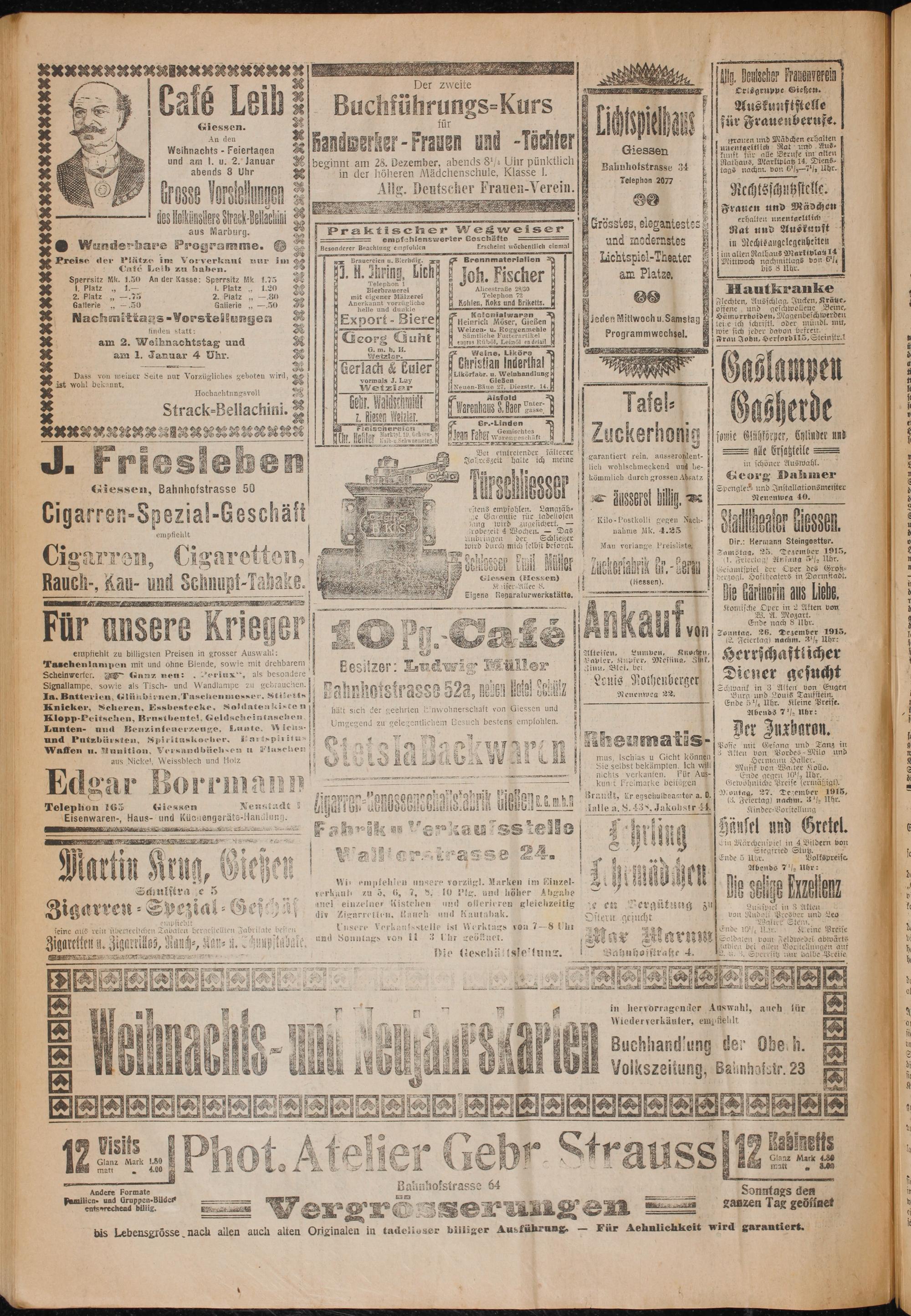 * d D 65 7 ⁊/7 TTT ͤ ͤ—v——... nich serkanfen. Für Auz- Ende gegen 10½ Uhr. Ede Al 0 1'In! 45 i 1 3—— 1 a 0— kunt marke beifügen Gewöhnliche Preise lermäßigt), Uerr e gsegzes ng; hp ighane e Brauclt, Er egschulbeamter a. J.. 10 27. Dezember 19 5 welephon 165 Giessen Neustadt Aha! 955 bse! Kobiadts In l be E 1 lalle g. S. 438, Jakobstr. 44 e Elsenwaren-, Haus- und Kügn zengeräte- aua lung. 5 5 8— 4 80. 5 — abe SS lle 4 0 Hänsel und Gretel. 0 a 5— 5 5 55 1 f 1* 2 15 13 11 Ein Märchenspiel in 4 Bildern von 5 6 8 2 5. 3 5 Siegfried Stutz. g 194 0 N 1 8 899 ö a 2 r e 4 b Ende 5 Uhr. Voltspreise 1 0 5 n. Geringe 3 ü ö N 8 7 ½ Uhr:. * 97 5.. 1. 905 2 0 83 J 5 1 5 Wi, empfehlen unsere vorzügl. Marken im Einzel- N l 0 1 1 sale a e 5 3 verkauf, zu 5, 6, 7, 8, 10 Pig. und höher Abgabe 0 l 0 11⁰ on 1 5. 0 2 Spez Ne mel einzelner tistehen und offerieren gleiellzeitig t en ergütt 77 0 4 f 5 J N 2 8 1 2 akt 1 8 N ö 50 garr eR⸗. zial⸗ G dis Zigarretten, 1 neh. und Mautabak. Oer 1 e, 99* von 9 ö 18 Leo. 14 die bl 8 1 ern 1 J 3 9 1 seine aus rein ü. ber. Tach en 555 gestellten Jabri ate besten 120. 55 Vork: 111 Ste 115 181 10 1 78 von 7—8 Uhl 3 Ende 10½½ e St 1 8 Preise f 5 . Aut 0 U. Jigar rillos, an b„ Nah lt H. und Sonntags von 11 3 Uhr ge i 2 7 Af 0 meet abwärts b 0 5— hie Geschittsle'tung. e Sahnho i Sperrstd mus dale ee 5 1 1 5 8 .. 0 1 in hervorragender Auswahl, auch für 1 . Wiederverkäuter, empflelult 00 3 8 8 U f a 1 Buchhandlung der Obe eh. 8