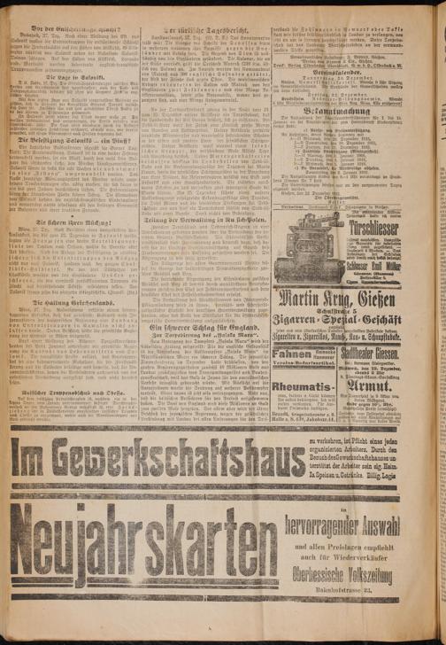in der ersten und zweiten Linie der feind ichen Se hützen⸗ E Donnerstag, ben 30. Dezember 1515, gräben. Unsere Artillerie warf viermal einen feind⸗ 5„Freitag, den 31. Dezember 1915.