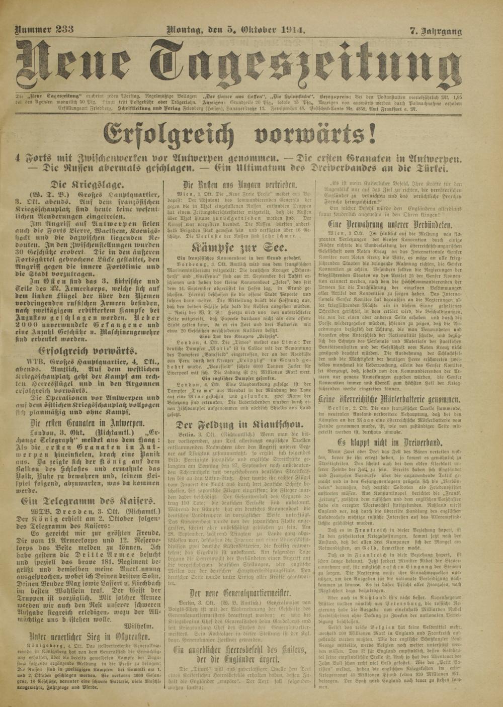4 Forts mit Zwischenwerken vor Antwerpen genommen. — Die ersten (Hranaterr in 2tntwerpen. — Die Russen abermals geschlagen. — Ein Ultimatum des Dreiverbandes an die Türkei.
