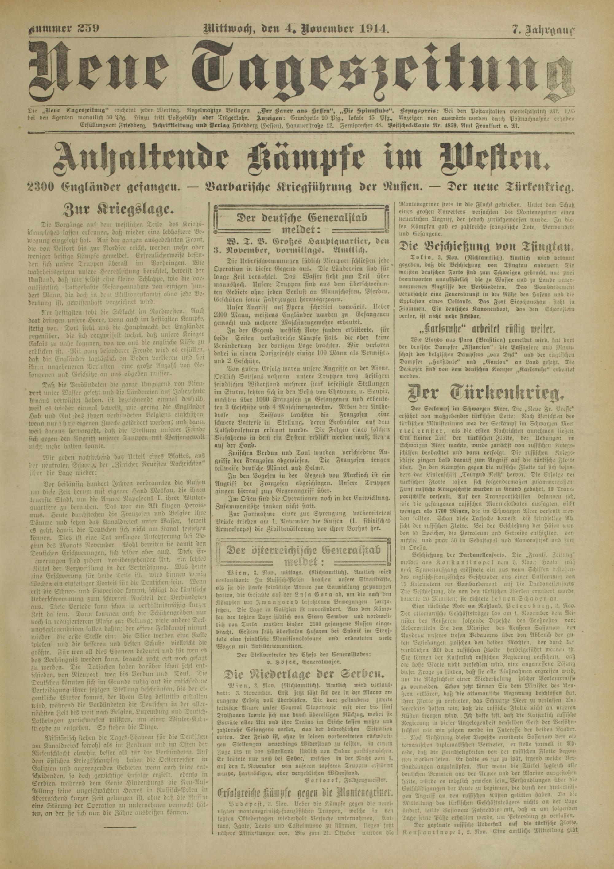 Die „rieue Tageszeitung ' erscheint leben Werttag. Regelmäßige Beilagen „Drr Kauer au» Hessen", „Die Kpinnssube". KklUgopreis: Bei den Postanstatte» vierieliährtich 'Mit. 1 ,90 lei den Agenten nionallich 50 Pig. hinzu tritt Postgebühr oder Trägerlohn. Auieigrn: Erundzeile 20 Psg., lokale 15 Psg, Anzeigen von auswärts werden durch Pastnachnahm.' cr>obe» Erfüllungsort Friedberg. SchriMeitung und Verlag Friedberg (Hessen), hanauerstrage 12. Ferniprecher 48. Poftfcheck-Lonto Nr. 4859, Amt Frantsurt a. M.