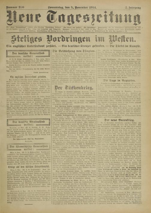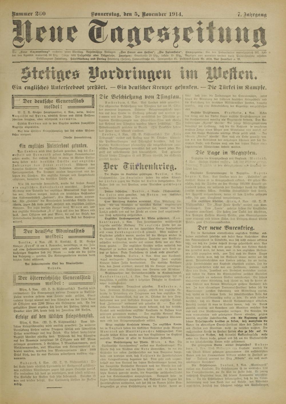 Ein englisches Dempsboot gcsuiike». Amsterdam. 4. Rov. Londoucr Meldungen zufolge, erhielt der englische Gesandte in Petersburg ein Telegramm von dem englische» B>- zekonsul in sloworossissk, daß am 30.. Oltober bei dem Bombardement von zwei türkischen Kreuzern das englische Tamps- boot „Jridericus" verbrannt und gesunken ist, — Das offizielle Londoner Presiebureau macht bekannt, daß der britische Konsul und verschiedene englische Kausleute in Bassora leien gelangen genommen worden. - Der englische General Mar- well lint die militärische Oberleitung über Aegypten übernommen und den Belagerungszustand ertlärt.