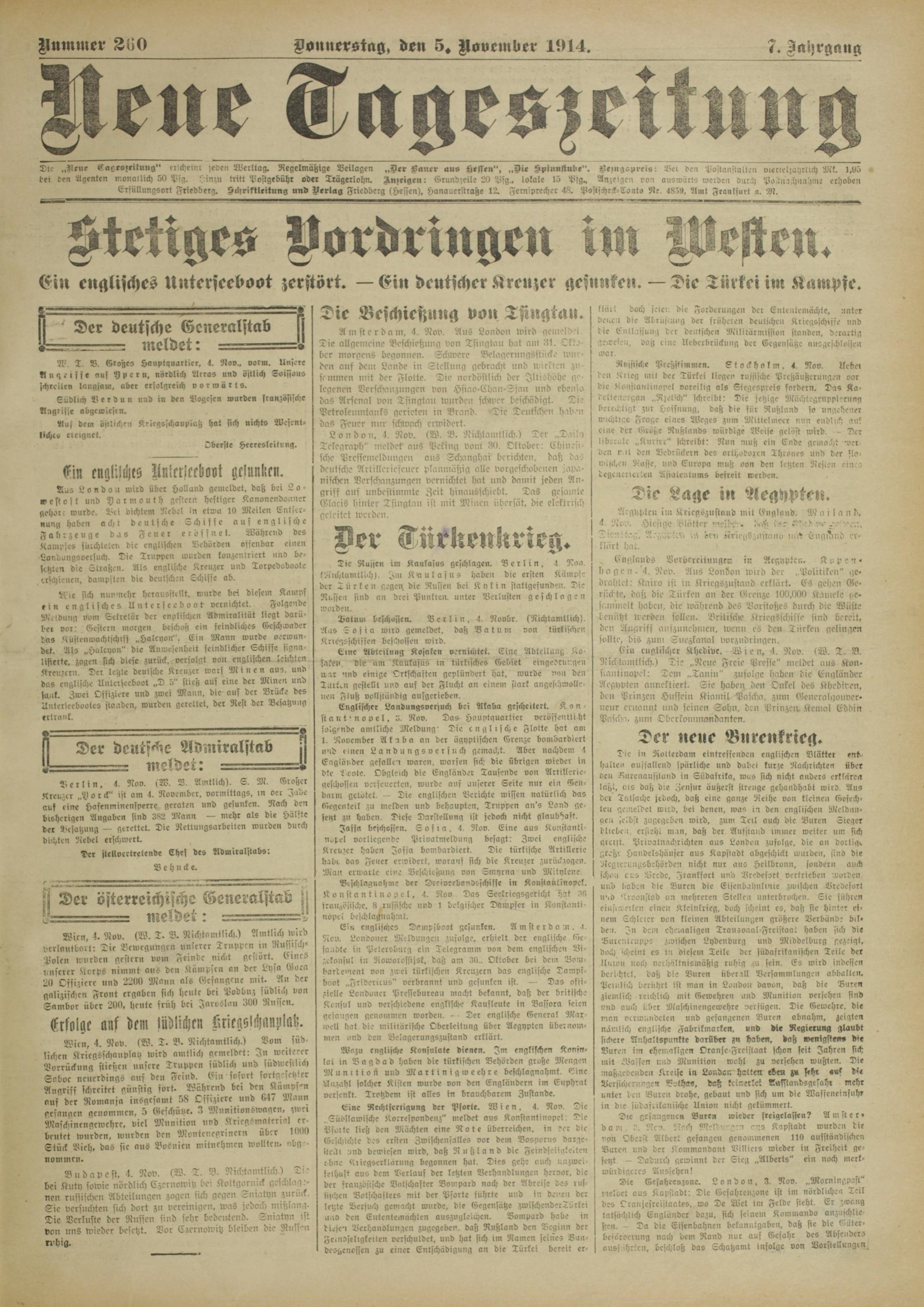 Ein englisches Unterseeboot zerstört. — Ein deutscher Kreuzer gesunken. — Die Türkei im Kampfe.
