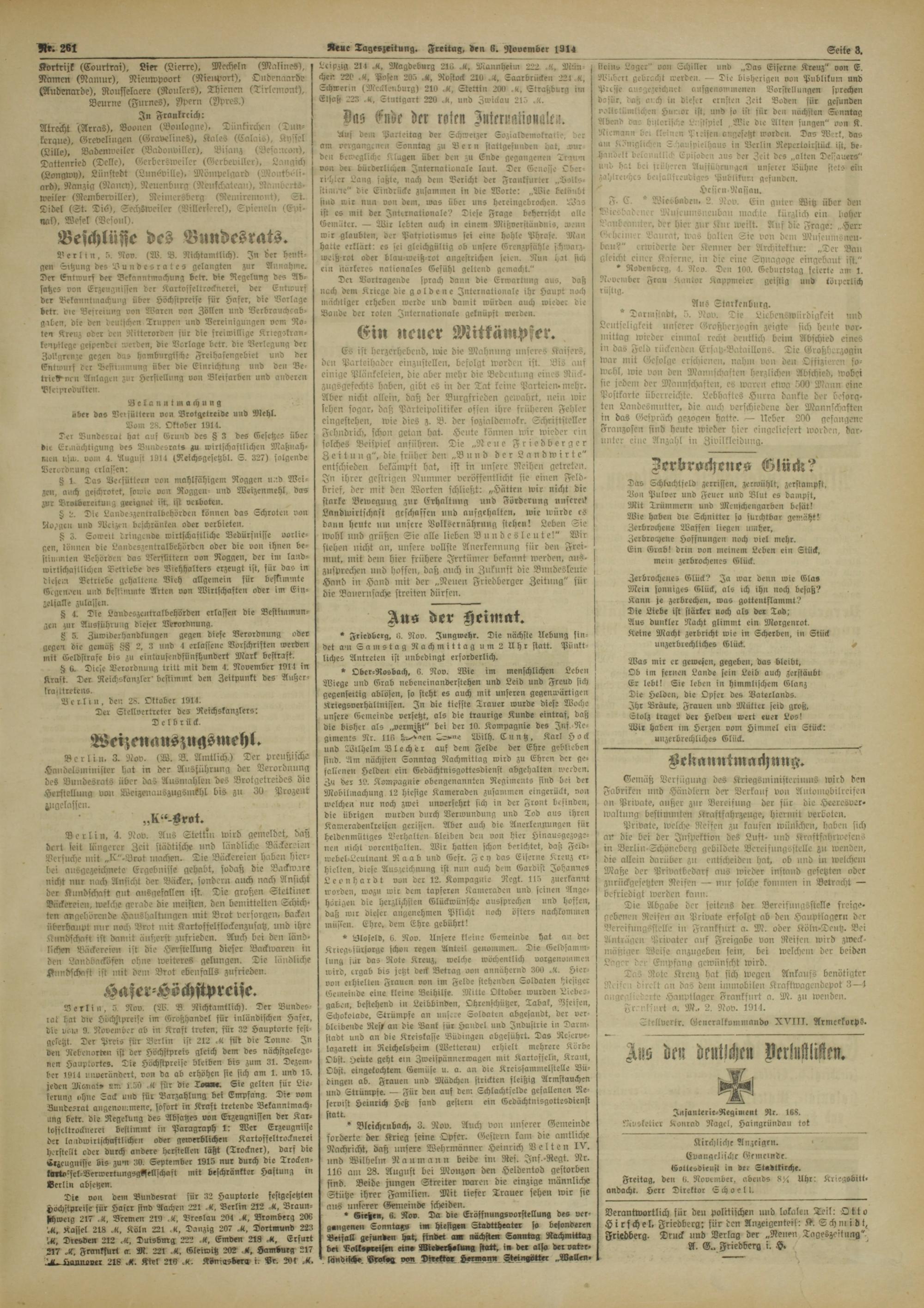 Wiege und Grab nebencinanderstehen und Leid und Freud sich gegenseitig ablösen, so sicht es auch mit unseren gegenwärtigen Kricgsverhältnisten. In die tiefste Trauer wurde diese Woche unsere Gemeinde versetzt, als die traurige Kunde eintraf, daß die bisher als ,^>crnnßt" bei der 10. Kompagnie des Inf. Ne- gimcnis Nr. 118 ic^^en Will». Euntz , Karl Hock