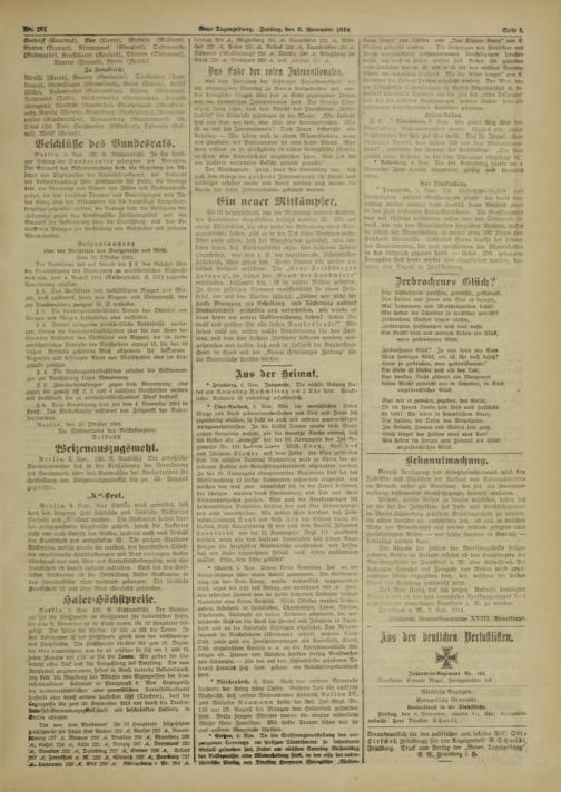 * Bleiche,ibnch. 3. Nov. Auch vo» unserer Gemeinde forderte der Krieg seine Opfer. Gestern kam die amtliche Nachricht, daß unsere Wehrmänner Heinrich Belten IV. und Wilhelm Naumann beide im Res. Jnf.-Regt. Nr. 116 am 28. August bei Mouzon den Heldentod gestorben sind. Beide jungen Streiter waren die einzige männliche Stütze ihrer Familien. Mit tiefer Trauer sehen wir sie aus unserer Gemeinde scheiden.