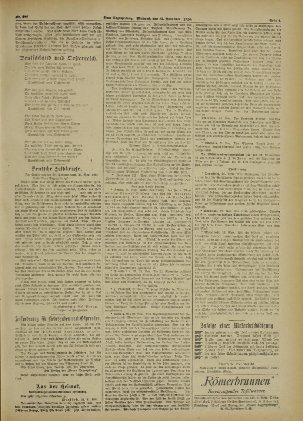 Das diesseitige Landstuimbataillon wird in der Margare- tenkaleine. unweit Haupkbahnhof, untergebiacht und wird noch seinem aollzähligen Eintresscn i» den eisten Tagen z» keinerlei Dienst hcrangezogcn. Do die Mannschaften laut Eouv.rne- mentrbcsehl einen längeren Urlaub als sieden Tage nicht erhalten laste tch bereits % des Bataillons Donnerstag und Freilag l26 und 27.i aus Utlavb gehen Der in Straßburg verbleibende Rest tritt nach RLcklchr des großen Urlaub- lchworms ebcnialls die Reise nach der Heimat aus sieben Tage an Welche Ausgabe noch Bollendung des Urlaubs dem Landsturmbataillon gestellt wirb, kann ich noch nicht lagen. Jeden- salis werde ich dies noch meinem Eintressen in Straßburg ei» sahrcn. Zum Schlüße sühre ich noch an. daß ich der Witwe des am 13. 11.it« Lazarett za Schlcttstadt verstorbenen Landsturmmanns Sporcnberg von Echzell aus versügbaren Mitteln des Ba'aillon. heule 3011 Mark als Unterstützung habe zug'h.'n lasse Weimer, Oberst n. B--tnillonskommandeur.