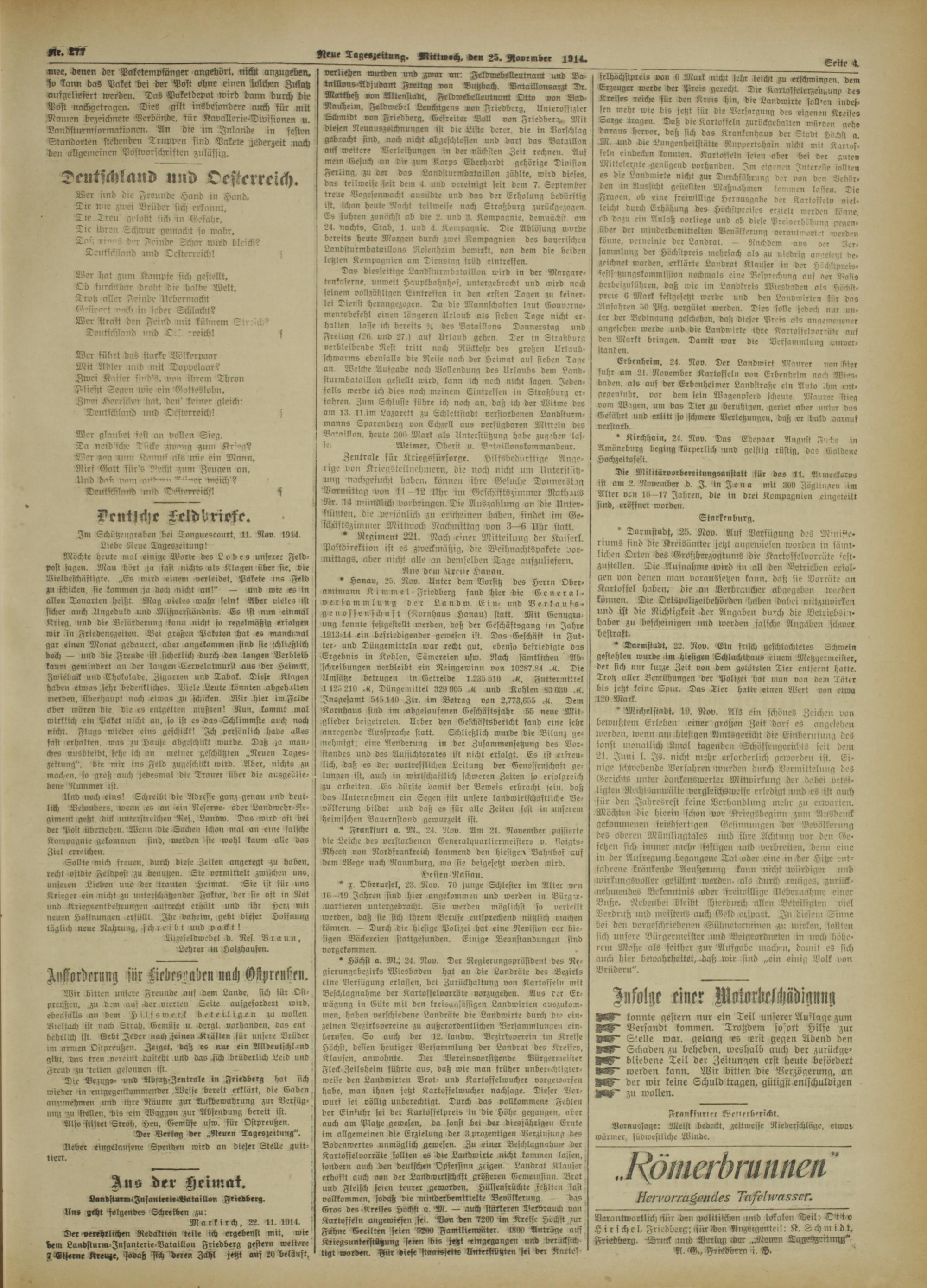 Verantwortlich für den püiitische» und likkolen Teil: Otzä v H i r I che l, Iricdüerg; isür Iben Anzeigenteil: K. Schm i b t , Friedberg -Druck und Lerlgg war .alteneu Tgge<>j":ri»gg" R. 'G.» Fr iodberg f. H.
