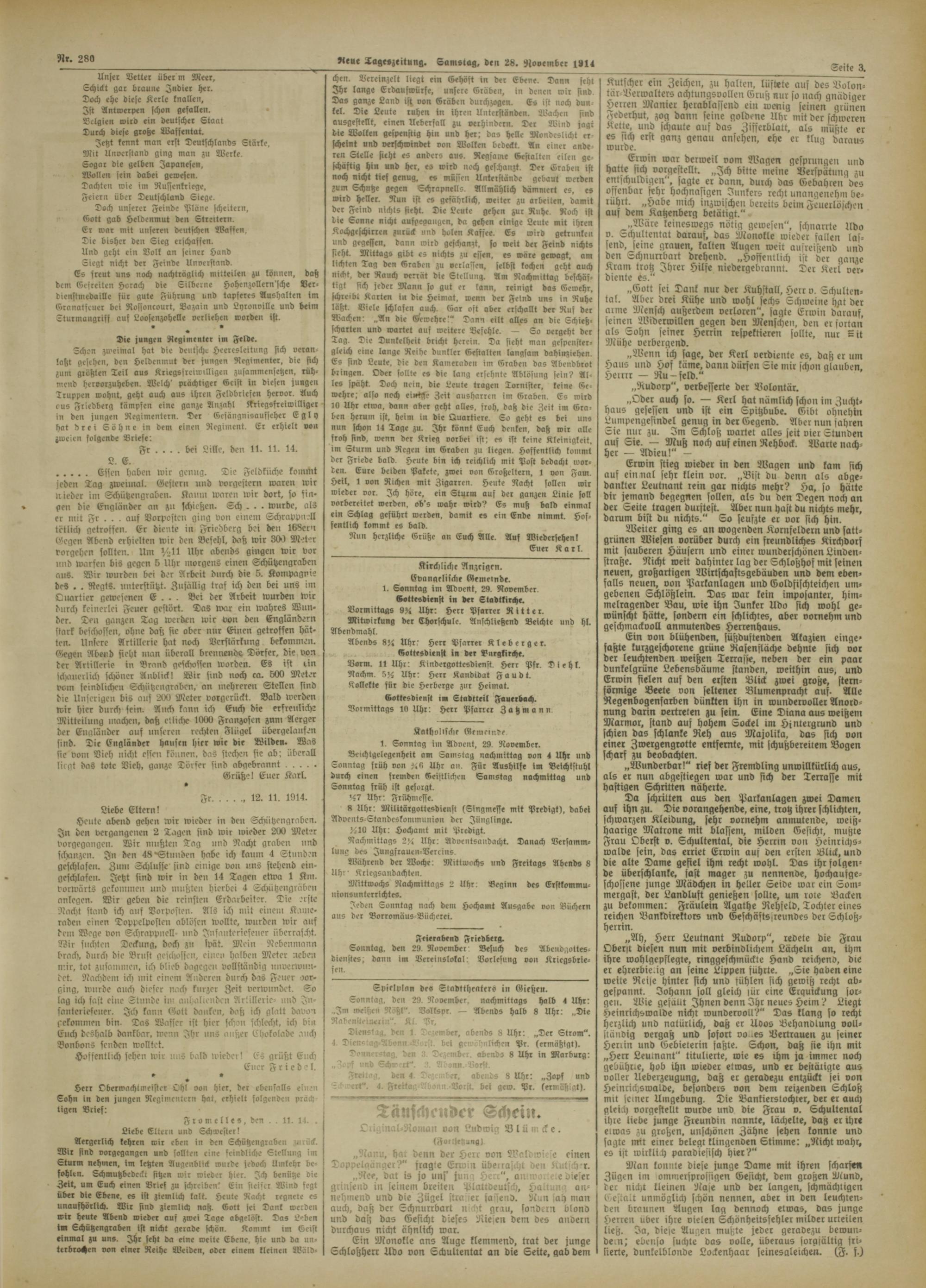 ..... Essen haben wir genug. Tie Feldkiiche kommt jeden Tag zwennal. (Sestern und vorgestern waren wir wieder im Schützengraben. Kaum waren wir dort, so fingen die Engländer an zn schieße». Sch . . - wurde, als er mit Fr . . . auf Vorposten ging von einem Schrapp,rell tätlich getroffen. Er diente in Fricdberg bei de» 168cc'i Gegen Abend erhielten wir den Befehl, daß wir 301 Meter Vorgehen sollten. Um V>U Uhr abends gingen wir vor und warfen bis gegen 5 Uhr morgens einen Schützengraben a»S. Wir wurden bei der Arbeit durch die 6. Kompagnie des . . Regt«, unterstützt. Zusällig traf ich den bei uns im Ouartier gewesenen E . . . Bei der Arbeit wurden wir durch keinerlei Feuer gestört. Das war ein wahres Wun- der. Ten ganzen Tag werden wir von den Engländern stark beschossen, ohne daß sie ober nur Einen getroffen hätten. Unsere Artillerie hat noch Verstärkung bekommen, stiegen Abend sieht man überall brennende Dörfer, die von der Artillerie in Brand geschossen worden. Es ist rin ickMierlich schöner Anblick! Wir sind noch ca. bllv Meter voin IcinblidK» Schützengraben, an mehreren Stellen sind die Unscrige» bis auf 200 Meter vorgerückt. Bald werden wir hier durch fein. Auch kann ich Euch die erfreulich: Mitteilung machen, daß etliche 1000 Franzosen znni Aerger der Engländer aus unseren rechten Flügel übergelaufen sind. Tic Engländer Hausen hier wir die Wilden. Was sie vom Vieh nicht essen können, das stechen sic ab: überall