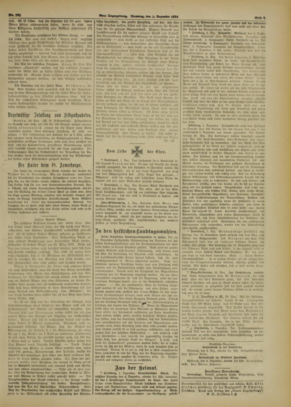 • Friedberg. 1. Dezember. Vaterläadifcher Abend, An, nächsten Sonntag den 8, Dezember, abends 8H Uhr, veranstaltet da; L Friedberger Doppelquartrtt im Saale de» Hotel Trapp eine» Vaterländische» Abend bestehend aus Liederoor- trägen und Rezitationen. Nähere« wird noch bekannt gegeben. Der Ertrag soll der hiesigen Lazarettverwaltung zu Weihnachtsgeschenken für die Verwundeten znr Verfügung gestellt