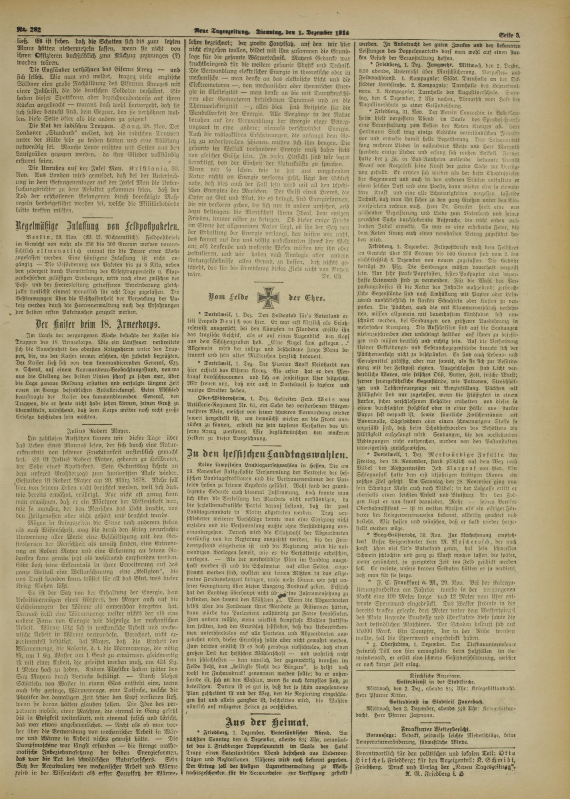 Obcr-W'ddersheim, 1. Dez. Gefreiter Feld. Weis vom Artillerie-Regiment Rr. bt, ein Sohn des verstorbenen Bürgermeisters Weis, welcher von feiner schweren Verwundung wieder soweit hergestellt ist, um demnächst wieder an die Front aus- rücken zu könne», erhielt für sein tapferes Verhalte» das Eiserne Kreuz zuerkannt. Wir beglückwünschen den wackeren Helden zu dieser Auszeichnung.