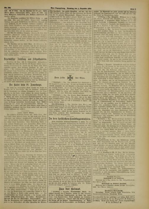 Im Lause der vergangenen Woche besuchte der Kaiser die Truppen des 18. Armeekorps. Wie ein Laufseuer verbreitete sich die Anwesenheit des obersten Kriegsherrn unter den Truppen, die, wo der Kaiser immer erschien, ihn subelnd begriifeten. Der Kaiser lieh sich von dem kommandierenden General, Erz. v. Schenck, auf einem Kommandeur-Beobachtungsstand, von wo aus die Stellung der beiden Linien scharf zu sehen war, über die Lage genaue Meldung erstatten und verfolgte längere Zeit einen im Gange befindlichen Artiellriekampf. Beim Abschied beauftragte der Kaiser de» kommandierenden General, den Truppe», die er heute nicht habe sehen können, seinen Grus, zu übermitteln, wünschend, das, dem Korps weiter noch recht grofee Erfolge beschieden sein möchten.