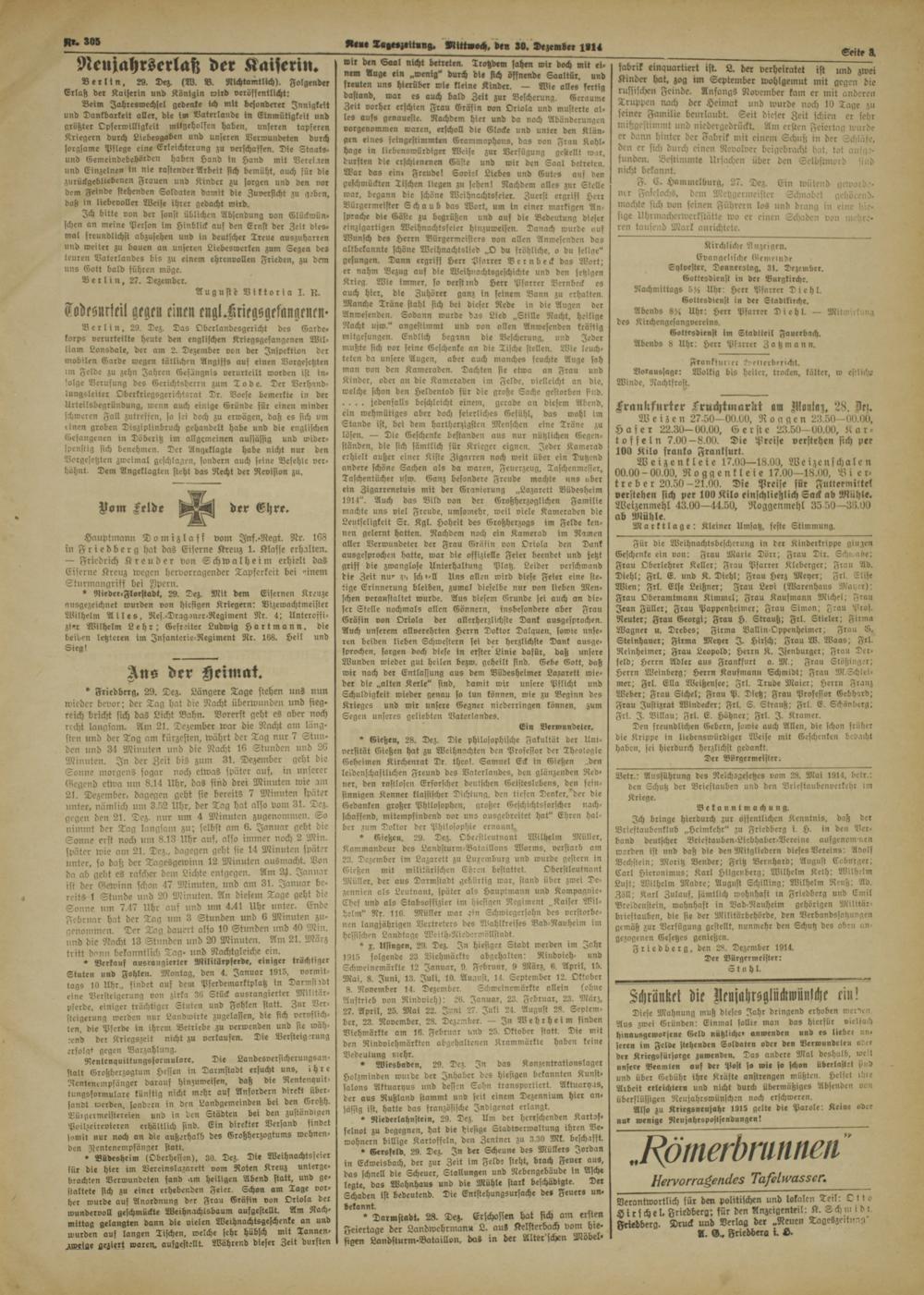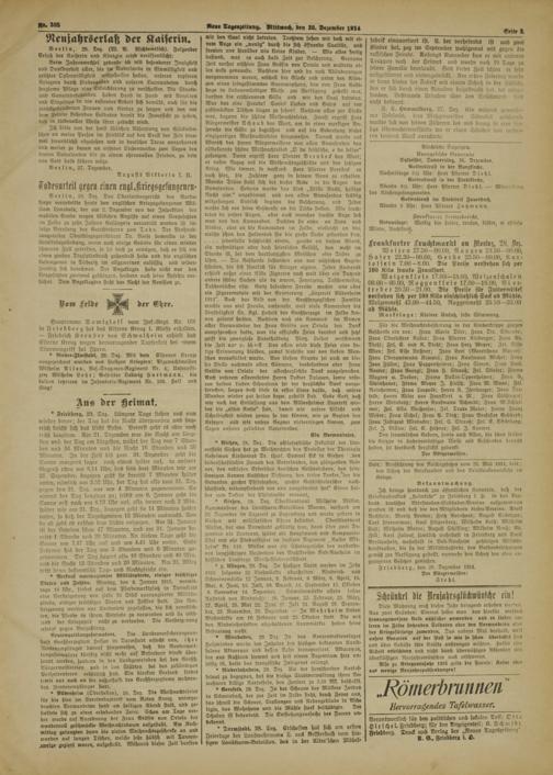 * Rieder-Florstadt, 29. Dez. Mit dem Eisernen Kreuze ausgezeichnet wurden von hiesigen Kriegern: Vizewachtmeister Wilhelm Alles, Res.-Draganer-Regiment Nr. 4; Unteroffizier Wilhelm Lehr: Gefreiter Ludwig Hart mann, die beiden letzteren im Insanlerie-Regiment Nr. 168. Heil und Sieg!
