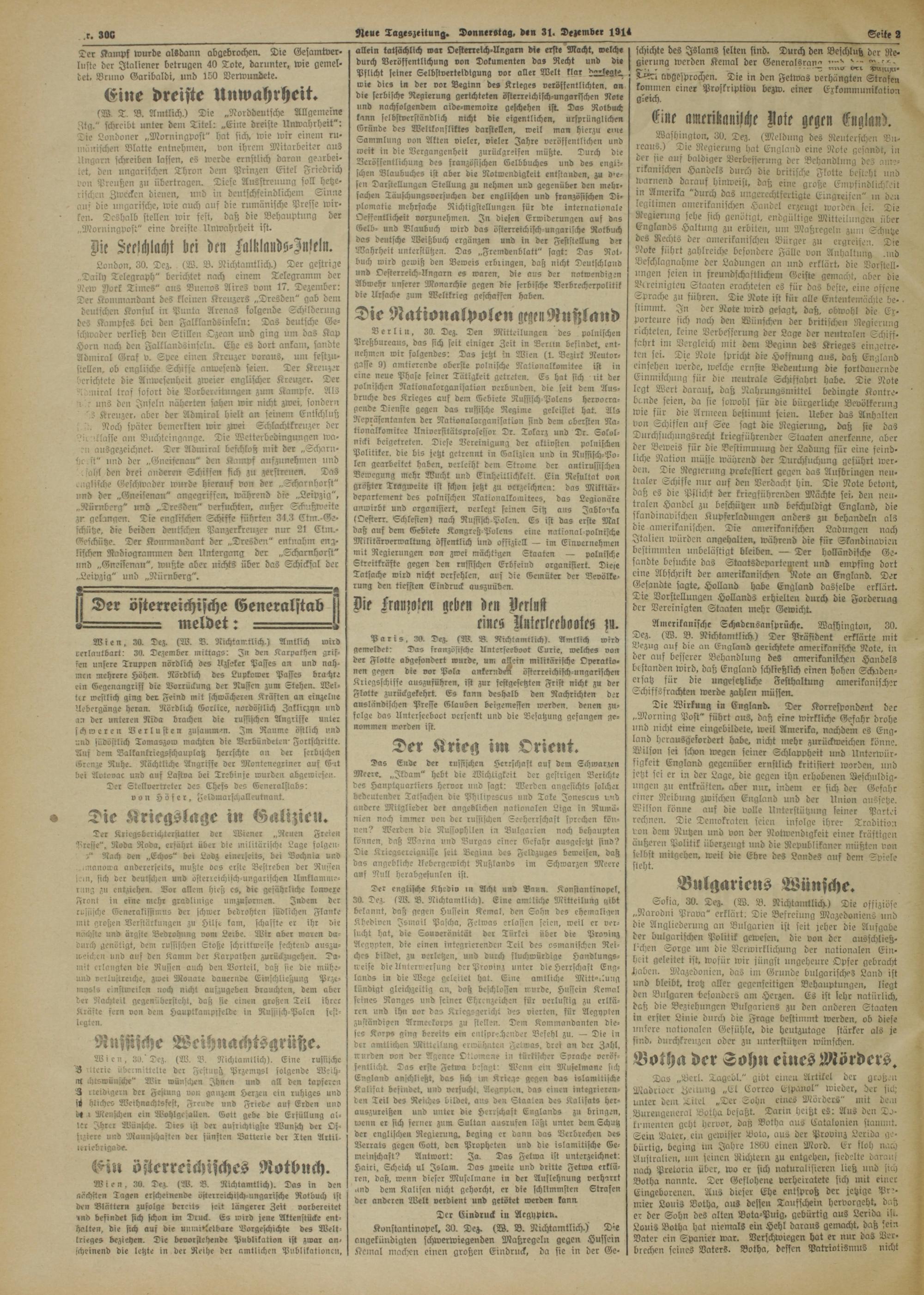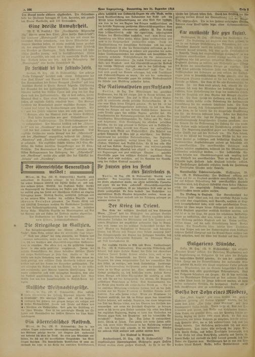 Neue Tageszeitung. Donnerstag, den 31. De^mbee 1314