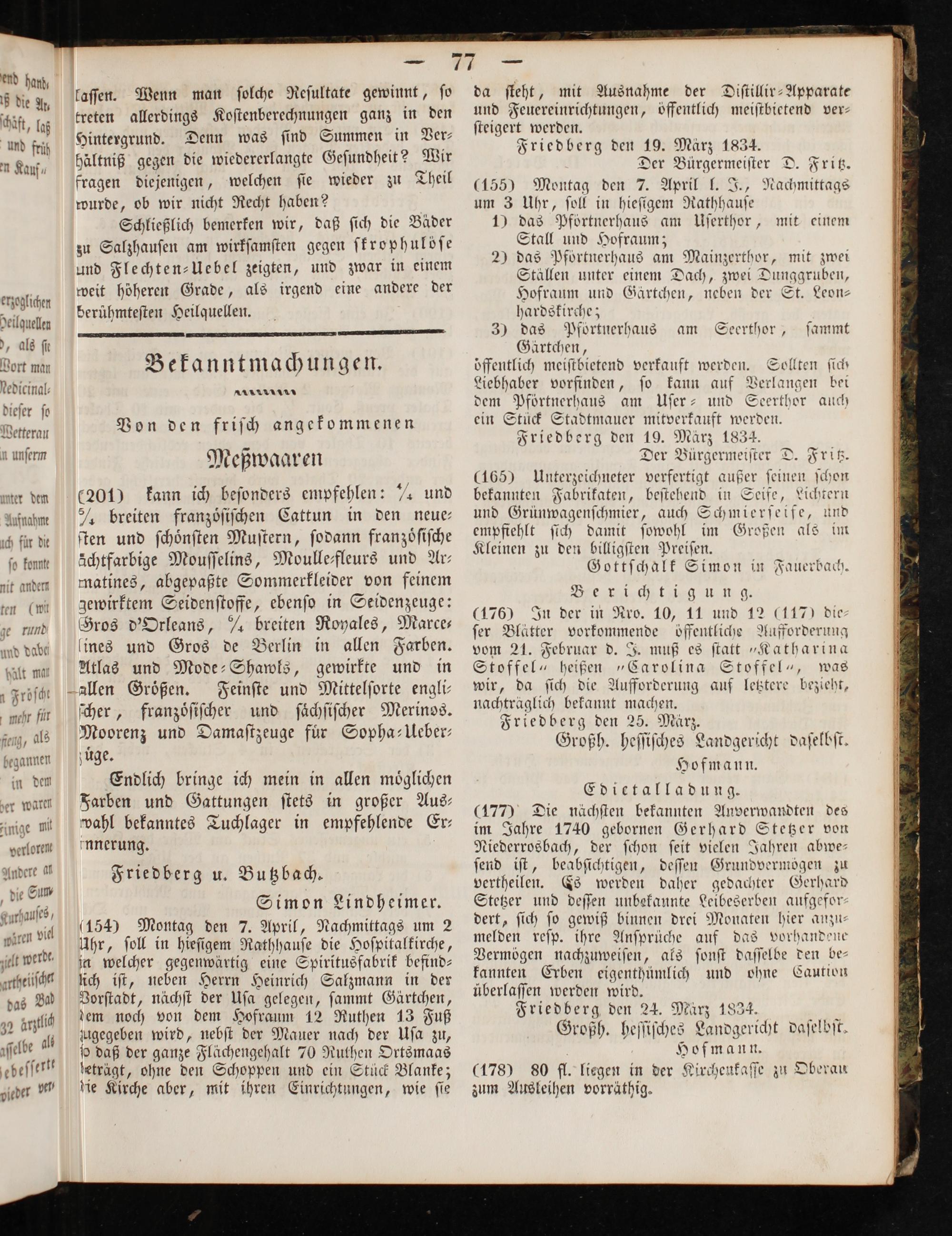 oͤffentlich meiſtbietend verkauft werden. Sollten ſich Liebhaber vorfinden, ſo kann auf Verlangen bei dem Pförtnerhaus am Uſer- und Seerthor auch ein Stück Stadtmauer mitverkauft werden. Friedberg den 19. März 1834. Der Bürgermeiſter D. Fritz. (165) Unterzeichneter verfertigt außer ſeinen ſchon bekannten Fabrikaten, beſtehend in Seife, Lichtern und Grünwagenſchmier, auch Schmierſeife, und empfiehlt ſich damit ſowohl im Großen als im Kleinen zu den billigſten Preiſen. Gottſchalk Simon in Fauerbach.