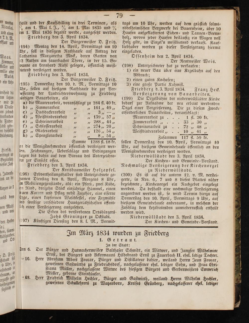 Friedberg d. 3. April 1834. Franz Heck. Verſteigerung von Bauarbeiten. (199) Die Orgelbühne der niederwöllſtaͤdter Kirche bedarf zur Aufnahme der neu erbaut werdenden Orgel einer Vergrößerung. Die zu dieſem Zwecke