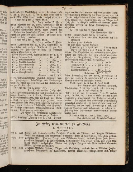 Im Maͤrz 1834 wurden zu Friedberg Geteg In der Stadt: den 6. Der Bürger und Hutmachermeiſter Balthaſer Schmidt, ein Wittwer, und Jungfer Wilhelmine Ernſt, des Bürgers und Ackermanns Hildebrand Ernſt zu Fauerbach II. ehel. ledige Tochter. „16. Herr Abraham Albert Foucar, Bürger und Diſtillateur dahier, weiland Herrn Jean Foucar, geweſenen Gaſtwirths zu Friedrichsdorf, nachgelaſſener ehel. lediger Sohn, und Frau Chri⸗ ſtiana Müller, nachgelaſſene Wittwe des hieſigen Bürgers und Gerbermeiſters Emmerich