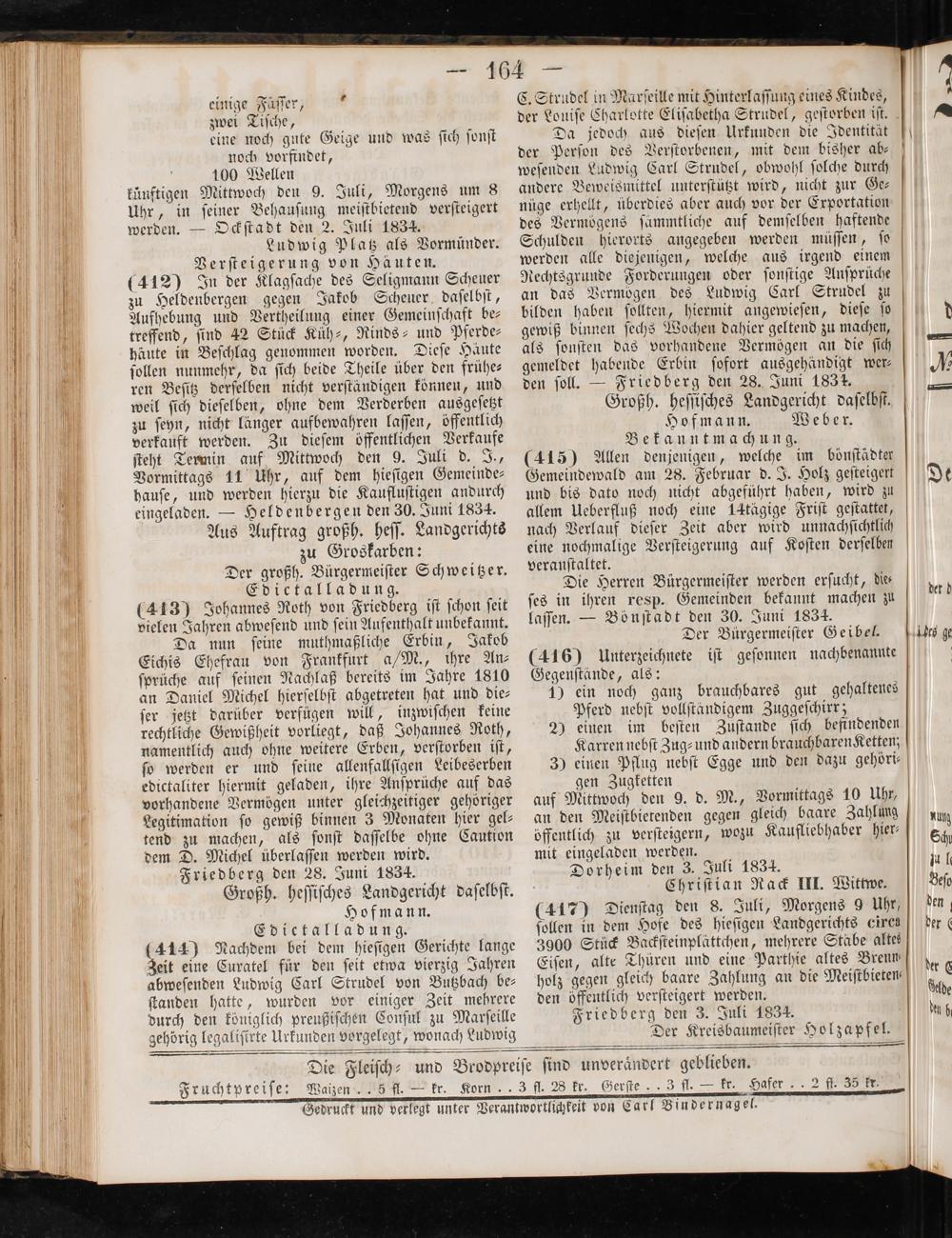 einige Fäſſer, zwei Tiſche, eine noch gute Geige und was ſich ſonſt noch vorfindet, 100 Wellen künftigen Mittwoch den 9. Juli, Morgens um 8 Uhr, in ſeiner Behauſung meiſtbietend verſteigert werden.— Ockſtadt den 2. Juli 1834. Ludwig Platz als Vormünder. Verſteigerung von Häuten. (412) In der Klagſache des Seligmann Scheuer zu Heldenbergen gegen Jakob Scheuer daſelbſt, Aufhebung und Vertheilung einer Gemeinſchaft be— treffend, ſind 42 Stück Küh⸗, Rinds- und Pferde⸗ häute in Beſchlag genommen worden. Dieſe Häute ſollen nunmehr, da ſich beide Theile über den frühe— ren Beſitz derſelben nicht verſtändigen können, und weil ſich dieſelben, ohne dem Verderben ausgeſetzt zu ſeyn, nicht länger aufbewahren laſſen, öffentlich verkauft werden. Zu dieſem öffentlichen Verkaufe ſteht Termin auf Mittwoch den 9. e d T Vormittags 11 Uhr, auf dem hieſigen Gemeinde- hauſe, und werden hierzu die Kaufluſtigen andurch eingeladen.— Heldenbergen den 30. Juni 1834. Aus Auftrag großh. heſſ. Landgerichts zu Groskarben: Der großh. Bürgermeiſter Schweitzer. Edictalladung. (413) Johannes Roth von Friedberg iſt ſchon ſeit vielen Jahren abweſend und ſein Aufenthalt unbekannt. Da nun ſeine muthmaßliche Erbin, Jakob Eichis Ehefrau von Frankfurt a/ M., ihre An⸗ ſprüche auf ſeinen Nachlaß bereits im Jahre 1810 an Daniel Michel hierſelbſt abgetreten hat und die⸗ ſer jetzt darüber verfügen will, inzwiſchen keine rechtliche Gewißheit vorliegt, daß Johannes Roth, namentlich auch ohne weitere Erben, verſtorben iſt, ſo werden er und ſeine allenfallſigen Leibeserben edictaliter hiermit geladen, ihre Anſprüche auf das vorhandene Vermögen unter gleichzeitiger gehöriger Legitimation ſo gewiß binnen 3 Monaten hier gel⸗ tend zu machen, als ſonſt daſſelbe ohne Caution dem D. Michel überlaſſen werden wird. Friedberg den 28. Juni 1834. Großh. heſſiſches Landgericht daſelbſt. Hofmann. Edietalladung. 414) Nachdem bei dem hieſigen Gerichte lange eit eine Curatel für den ſeit etwa vierzig Jahren abweſenden Ludwig Carl Strudel von Butzbach be— ſtanden hatte, wurden vor einiger Zeit mehrere durch den königlich preußiſchen Conſul zu Marſeille gehörig legaliſirte Urkunden vorgelegt, wonach Ludwig