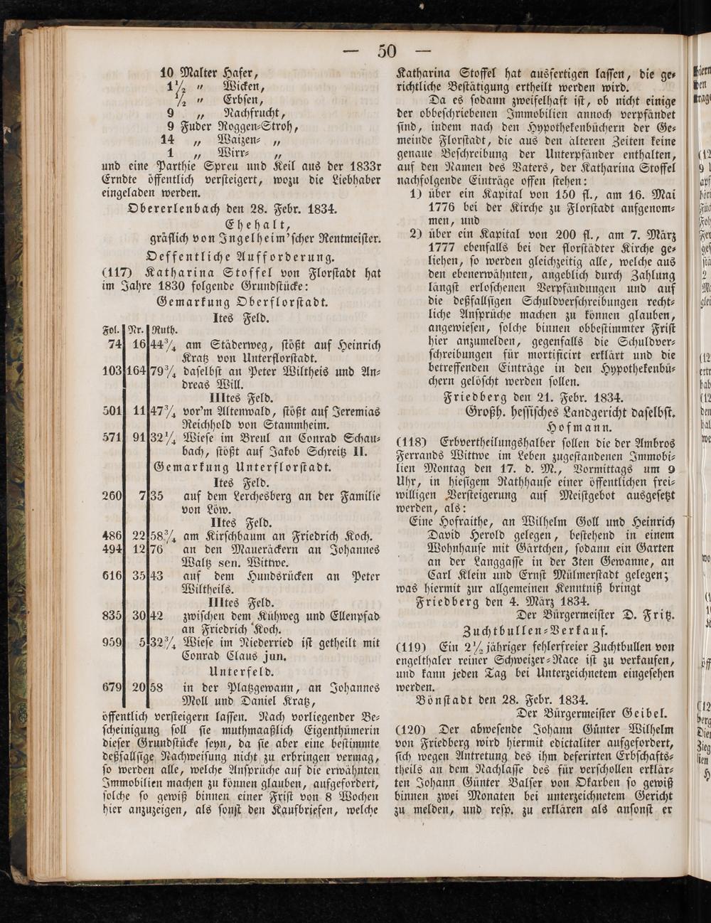 Da es ſodann zweifelhaft iſt, ob nicht einige der obbeſchriebenen Immobilien annoch verpfändet ſind, indem nach den Hypothekenbüchern der Ge— meinde Florſtadt, die aus den alteren Zeiten keine genaue Beſchreibung der Unterpfänder enthalten, auf den Namen des Vaters, der Katharina Stoffel nachfolgende Einträge offen ſtehen: