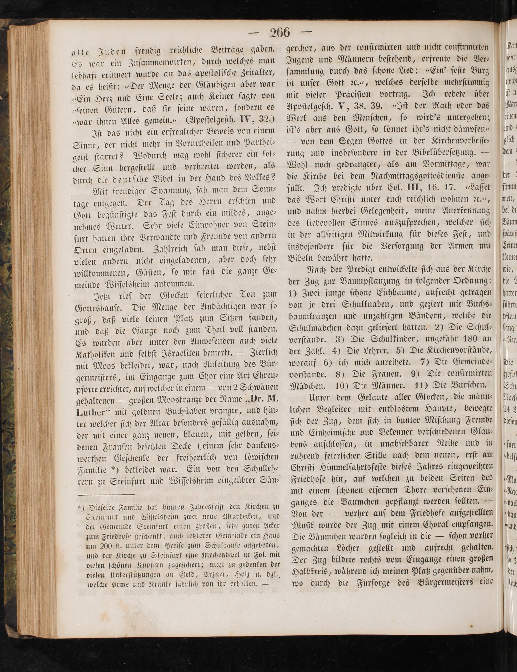 „ Dieſelbe Familie hat binnen Jahresfriſt den Kirchen zu Steinfurt und Wiſſelsheim zwei neue Altardecken, und der Gemeinde Steinfurt einen großen, ſehr guten Acker zum Friedhofe geſchenkt, auch letzterer Gemeinde ein Haus um 200 ff. unter dem Preiſe zum Schulhauſe angeboten, und der Kirche zu Steinfurt eine Kirchenbibel in Fol. mit vielen ſchönen Kupfern zugeſichert; nicht zu gedenken der vielen Unterſtutzungen an Geld, Arznei, Holz u. dgl., welche Arme und Kranke jährlich von ihr erhalten.—