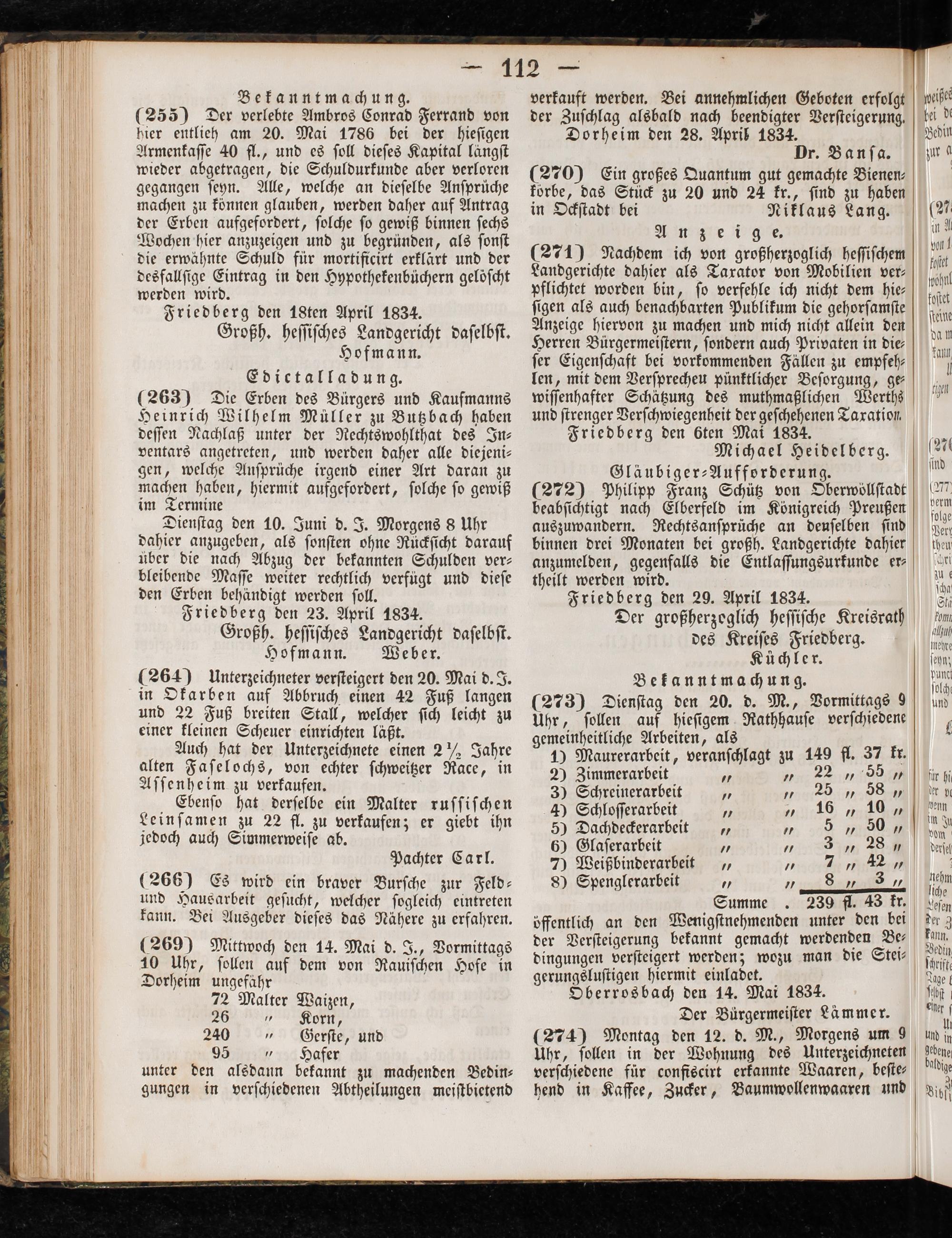 Friedberg den 6ten Mai 1834. Michael Heidelberg. Gläubiger-Aufforderung. (272) Philipp Franz Schütz von Oberwöllſtadt beabſichtigt nach Elberfeld im Königreich Preußen auszuwandern. Rechtsanſprüche an deuſelben ſind binnen drei Monaten bei großh. Landgerichte dahier anzumelden, gegenfalls die Entlaſſungsurkunde er⸗ theilt werden wird. Friedberg den 29. April 1834. Der großherzoglich heſſiſche Kreisrath des Kreiſes Friedberg. Küchler. Bekanntmachung. (273) Dienſtag den 20. d. M., Vormittags 9 Uhr, ſollen auf hieſigem Rathhauſe verſchiedene gemeinheitliche Arbeiten, als 1) Maurerarbeit, veranſchlagt zu 122 fl. 37 kr.