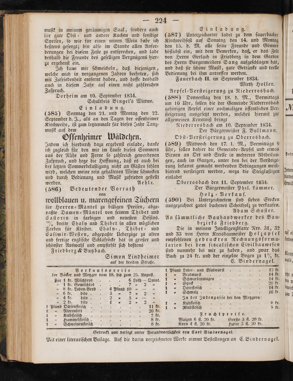 Einladung. (587) Unterzeichneter ladet zu dem fauerbacher Kirchweihfeſt auf Sonntag den 14. und Montag den 15. d. M. alle ſeine Freunde und Gönner höflichſt ein, mit dem Bemerken, daß er das Zelt von Herrn Gerlach in Friedberg in dem Garten des Herrn Bürgermeiſters Sang aufgeſchlagen hat, und daß ſie ſchöne Muſik, gute Getränke und reelle Bedienung bei ihm antreffen werden. Fauerbach II. im September 1834. Wirth Holler. Aepfel-Verſteigerung zu Niederrosbach. (588) Donnerſtag den 18. d. M., Vormittags um 10 Uhr, ſollen die der Gemeinde Niederrosbach gehörigen Aepfel einer nochmaligen öffentlichen Ver— ſteigerung ausgeſetzt werden, welches hiermit zur allgemeinen Kenntniß bringt Niederrosbach am 10. September 1834. Der Bürgermeiſter F. Bullmann. Obſt-Verſteigerung zu Oberrosbach.