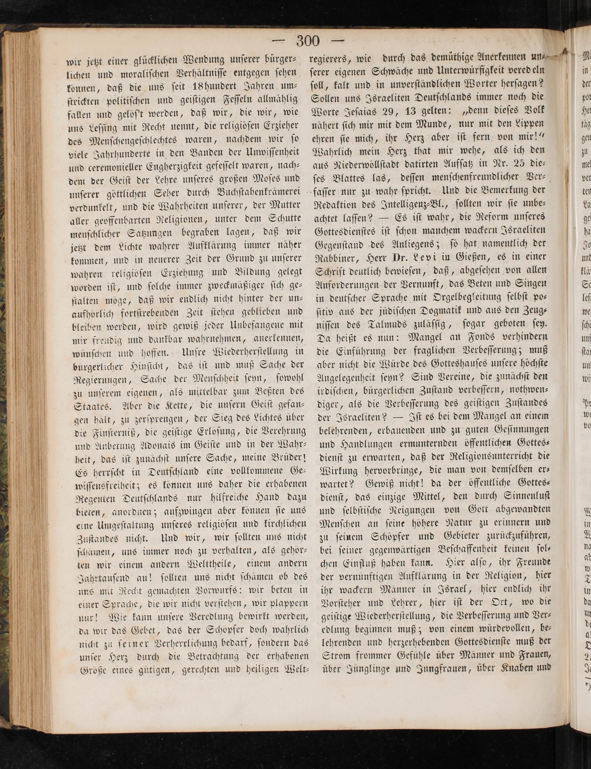 Und die Bemerkung der Redaktion des Intelligenz-Bl., ſollten wir ſie unbe— achtet laſſen?— Es iſt wahr, die Reform unſeres Gottesdienſtes iſt ſchon manchem wackern Israeliten Gegenſtand des Anliegens; ſö hat namentlich der Rabbiner, Herr Dr. Levi in Gießen, es in einer Schrift deutlich bewieſen, daß, abgeſehen von allen Anforderungen der Vernunft, das Beten und Singen in deutſcher Sprache mit Orgelbegleitung ſelbſt po— ſitiv aus der jüdiſchen Dogmatik und aus den Zeug niſſen des Talmuds zuläſſig, ſogar geboten ſey. Da heißt es nun: Mangel an Fonds verhindern die Einführung der fraglichen Verbeſſerung; muß aber nicht die Würde des Gotteshauſes unſere höchſte Angelegenheit ſeyn? Sind Vereine, die zunächſt den irdiſchen, bürgerlichen Zuſtand verbeſſern, nothwen— diger, als die Verbeſſerung des geiſtigen Zuſtandes der Israeliten?— Iſt es bei dem Mangel an einem belehrenden, erbauenden und zu guten Geſinnungen und Handlungen ermunternden öffentlichen Gottes dienſt zu erwarten, daß der Religionsunterricht die Wirkung hervorbringe, die man von demſelben er— wartet? Gewiß nicht! da der öffentliche Gottes— dienſt, das einzige Mittel, den durch Sinnenluſt und ſelbſtiſche Neigungen von Gott abgewandten Menſchen an ſeine höhere Natur zu erinnern und zu ſeinem Schöpfer und Gebieter zurückzuführen, bei ſeiner gegenwartigen Beſchaffenheit keinen ſol— chen Einfluß haben kann. Hier alſo, ihr Freunde der vernünftigen Aufklärung in der Religion, hier ihr wackern Männer in Israel, hier endlich ihr Vorſteher und Lehrer, hier iſt der Ort, wo die geiſtige Wiederherſtellung, die Verbeſſerung und Ver— edlung beginnen muß; von einem würdevollen, be— lehrenden und herzerhebenden Gottesdienſte muß der Strom frommer Gefühle über Männer und Frauen, über Jünglinge und Jungfrauen, über Knaben und