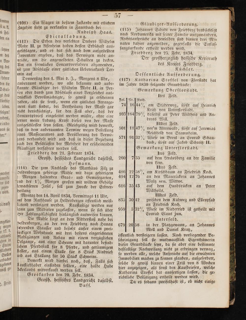 Gläubiger- Aufforderung. (115) Johannes Schudt von Friedberg beabſichtigt nach Nordamerika mit ſeiner Familie auszuwandern. Rechtsanſprüche an denſelben ſind binnen drei Mo— naten dahier anzumelden, gegenfalls die Entlaſ— ſungsurkunde ertheilt werden wird. Friedberg den 25. Febr. 1834. Der großherzoglich heſſiſche Kreisrath des Kreiſes Friedberg. Küchler. Oeffentliche Aufforderung. (117) Katharina Stoffel von Florſtadt hat im Jahre 1830 folgende Grundſtücke: Gemarkung Oberflorſtadt. Ites Feld.
